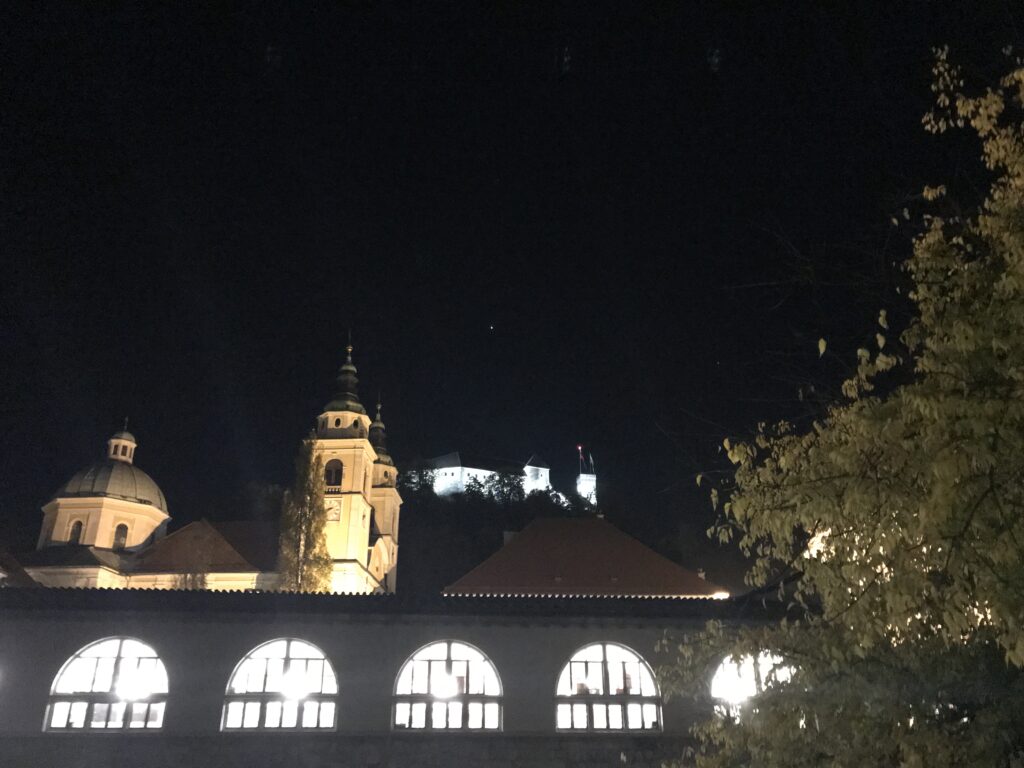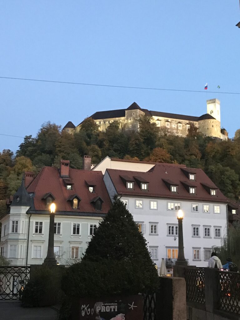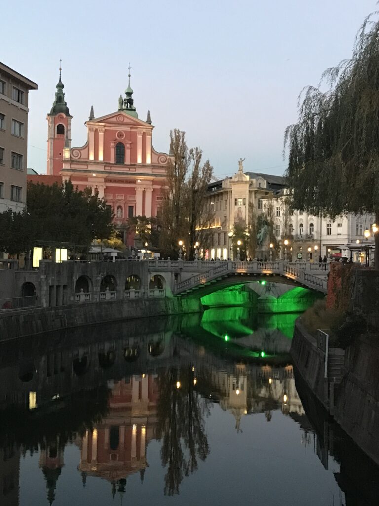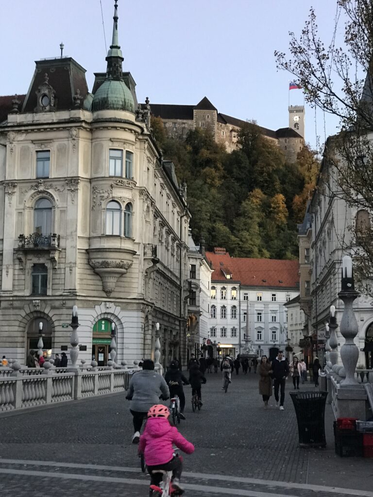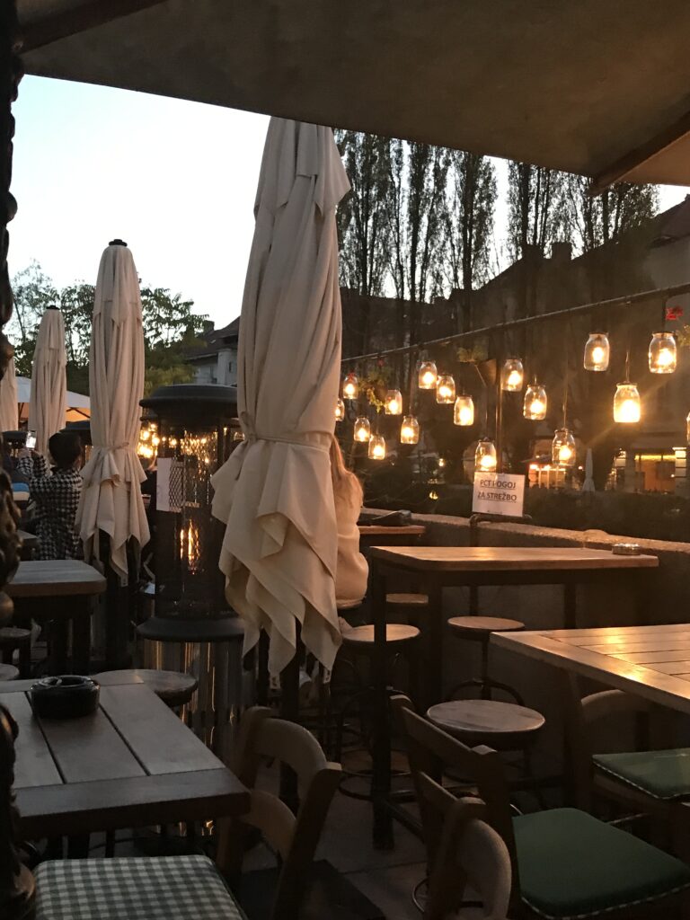 Erste sehr schöne Eindrücke sammelten wir dann von Ljubljana. Als die Sonne weg war wurde es ganz schön kuschelig. Wir schwangen uns in unsere dicken Jacken, Burkhard mit Mütze und streunten hungrig, nach Essen suchend, umher und dachten schon unsere Mägen werden nicht gefüllt. Am Fluss entlang lauter Tische draußen.