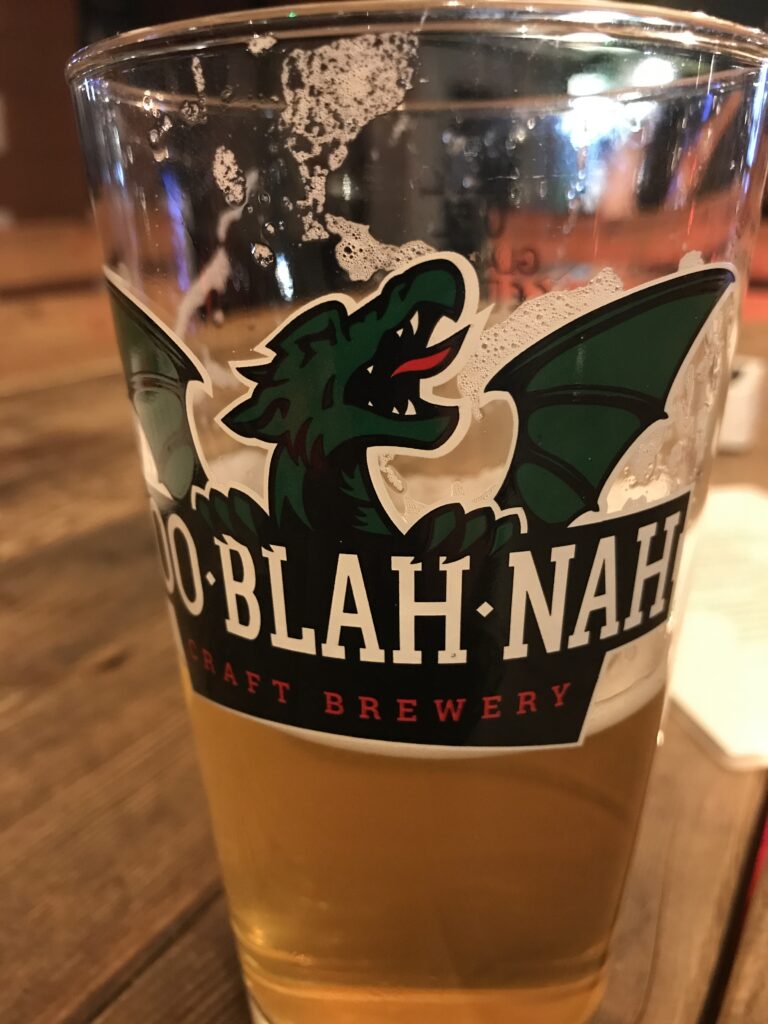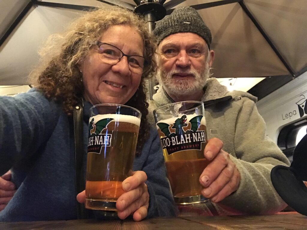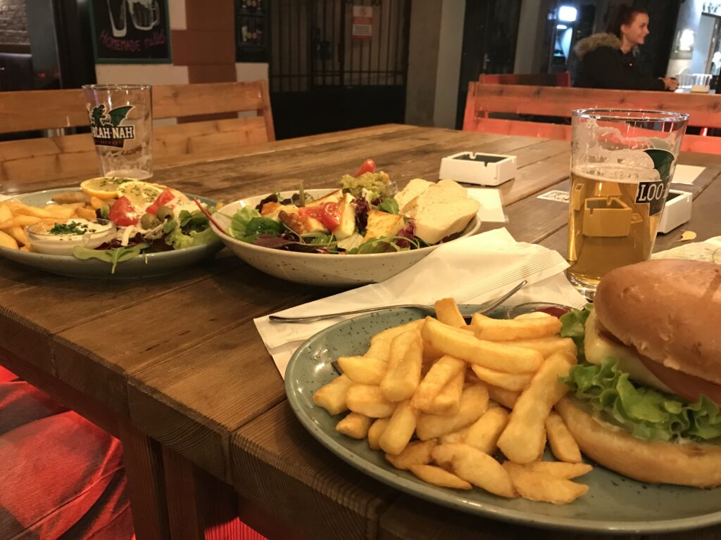 Alles Cafés, Eiscafés und Bars, gute Stimmung lauter junge Leute, keine Restaurants, außer einer Pizzeria, was wir nur im Notfall wollten. So hat man uns einen schönen Abendspaziergang in der Innenstadt beschert. Weiter hinten dann, auch schön am Fluss gelegen, haben wir einen Kellner gesehen, der, in einer Art Bistro, Essen in Pfannen austrug. Schnell sind wir da sesshaft geworden und haben sehr gut gegessen. Ich hätte nicht gedacht, dass ich sogar ganz zufällig noch etwas Vegetarisches bekomme – einen guten Veggiburger und einen leckeren Salat. Man jetzt habe ich sogar mal unser Essen fotografiert. Dann gesellten sich noch, natürlich mit gebührendem Abstand, 4 junge Leute an unseren Tisch gesellt. Wir kamen ins Gespräch, sie waren aus Südserbien und erzählten uns, dass sie zum Ljubljana-Marathon angereist sind, er war heute, wir haben ihn kurz verpasst. Danach wussten wir, warum sie Gitter an einem Platz weggeräumt hatten, wir dachten es war ein Fest. Der Sympathischste der vier ist mitgelaufen, Halbmarathon in 1 Std. 45 Minuten. Wir prosteten uns mit einem tollen Craft Beer zu, das war so lecker das Bier. Ganz nebenbei erfuhren wir dabei, dass Ljubljana die „Drachenstadt“ ist (siehe Bierglas). Ein schöner Tagesabschluss mit internationalem Austausch.