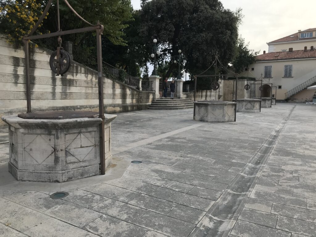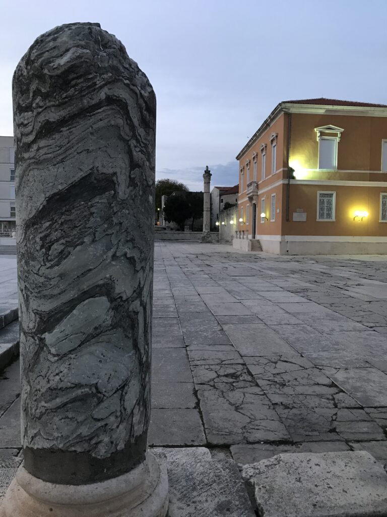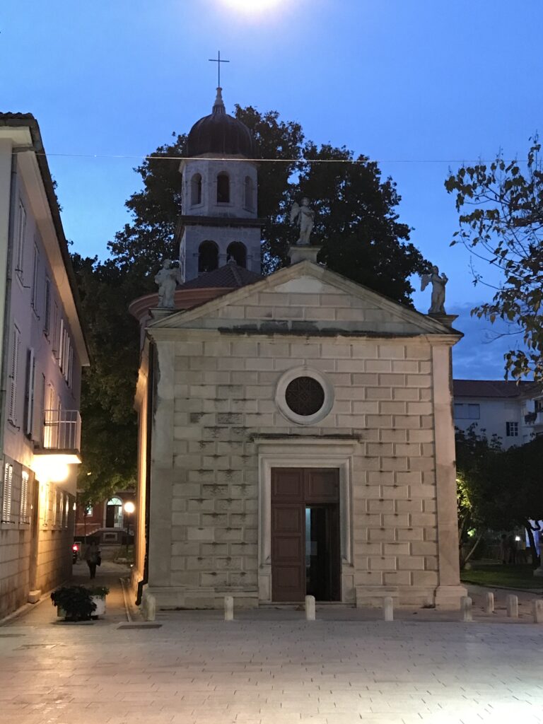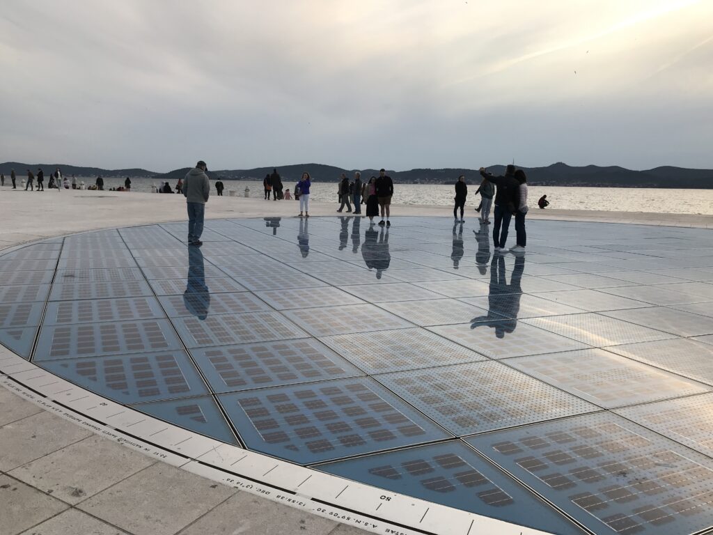 Im ersten Anlauf hat es uns gar nicht so gut gefallen, wir waren eher ein bisschen enttäuscht. In der Altstadt gibt es doch sehr viele Häuser aus der Nachkriegszeit, die in einem sehr desolatem Zustand sind, dazwischen ein paar schöne alte venezianische Gebäude und einige römische Überbleibsel. Im zweiten Anlauf, nachdem wir unser Zimmer bezogen hatten, gingen wir nochmal los und dann konnten wir uns doch noch mit Zadar versöhnen, es hat uns gut gefallen. Vor allem als es dunkel war, war eine schöne Stimmung und Atmosphäre, die kleinen Gassen kamen dann ganz anders rüber und der Bummel machte richtig Spaß. Sehr schön war der Spaziergang auf der Mauer (sie ist ja UNESCO- Weltkulturerbe), hier haben sie schöne Spazierwege angelegt, es gibt schöne alte Bäume und gute Aussichten. Vorbei kamen wir dann auch bei der Meeresorgel, es sind komische Töne, die das Meer hier verursacht, aber der Platz ist sehr schön, auch mit der aus 300 Einzelteilen bestehenden Glasscheibe mit 22m Durchmesser, es befinden sich darunter Solarmodule, der Strom wird eingespeist – man nennt das Ganze „Sonnenanbetung“.