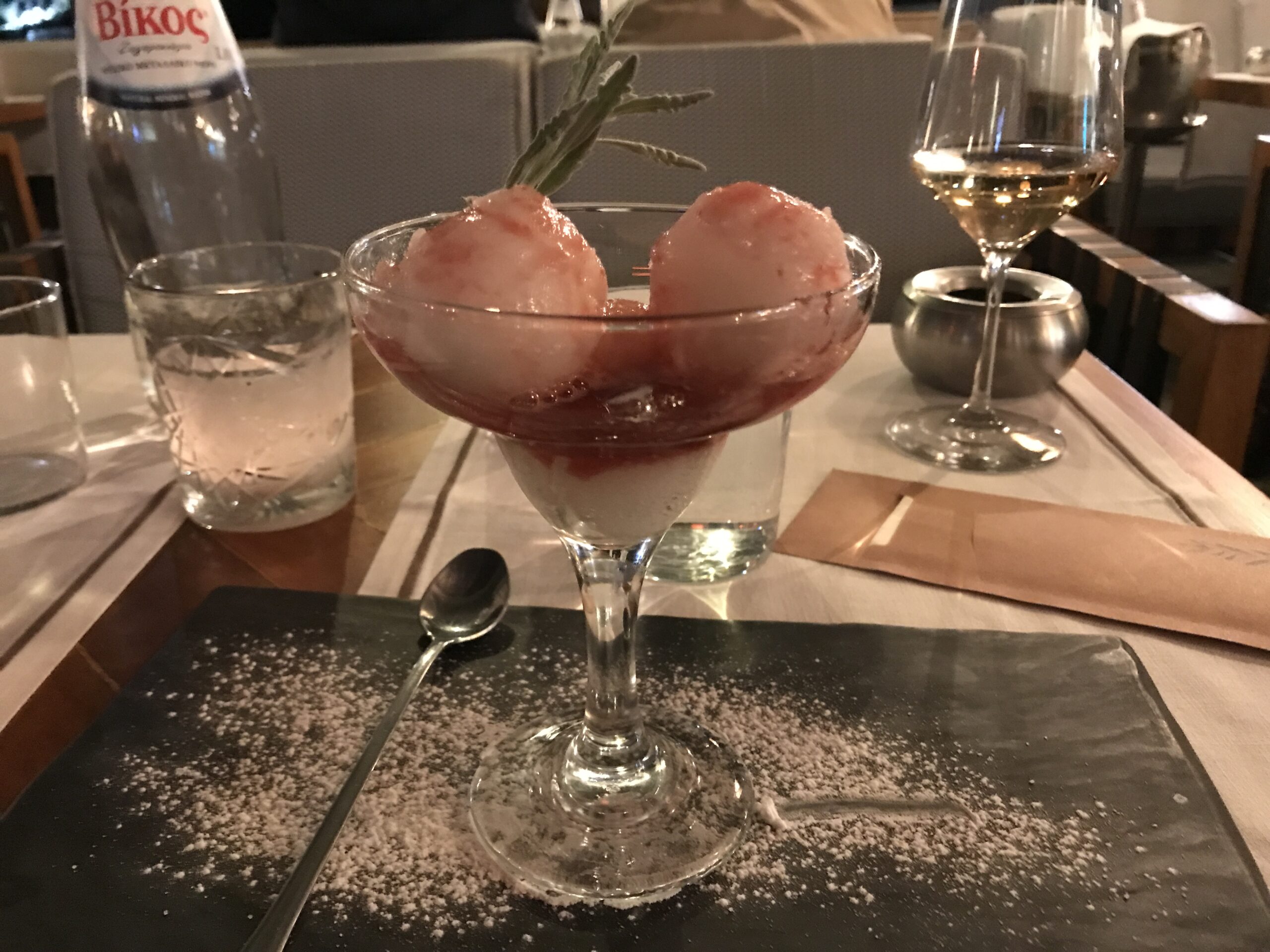 Alexis gab uns eine super Restaurantempfehlung, es war eines der vielen schönen Restaurants an der Strandpromenade. Klar um diese Jahreszeit war es nicht mehr voll, so hat sich der so freundliche Chef des Hauses viel Zeit gelassen und sich sehr gut mit uns unterhalten. Es war sein vorletzter Öffnungstag in der Saison erzählte er uns – von November bis April macht er immer zu. Nachdem ich ihn fragte wo es denn in Urlaub hingeht, kamen wir länger ins Gespräch. Nein, sie bleiben hier. In der Saison haben sie keinerlei Zeit für irgend etwas, nur arbeiten 10-12 Stunden und immer im Stress. Die Familie und alles andere kommt viel zu kurz und jetzt ist dies alles dran. Dann natürlich Renovierungen, Planungen, Verwaltung, Buchhaltung etc. Und trotzdem genießen Siedler Zeit. Er freute sich schon sehr so gut gelaunt er war. Und dann das Essen, super lecker, der Wein sehr gut – das war für unseren Griechenlandeinstieg alles wunderbar. Ich gönnte mir einen Nachtisch ein Champagner-Sorbet mit Rosenzucker. Der Chef erklärte mir, dass er den Zucker aus einem Kloster bezieht, die das in langer Tradition herstellen.