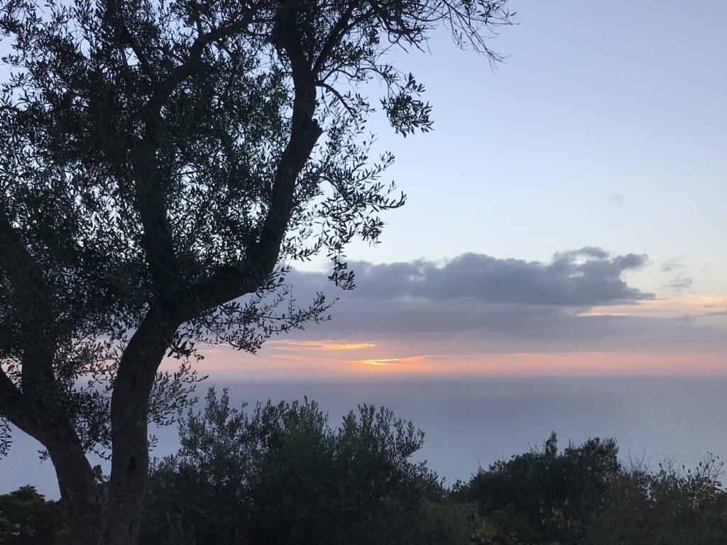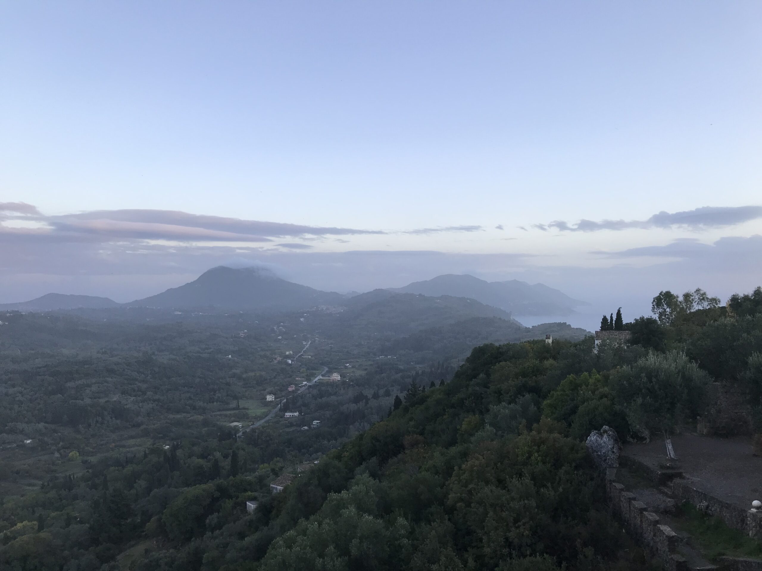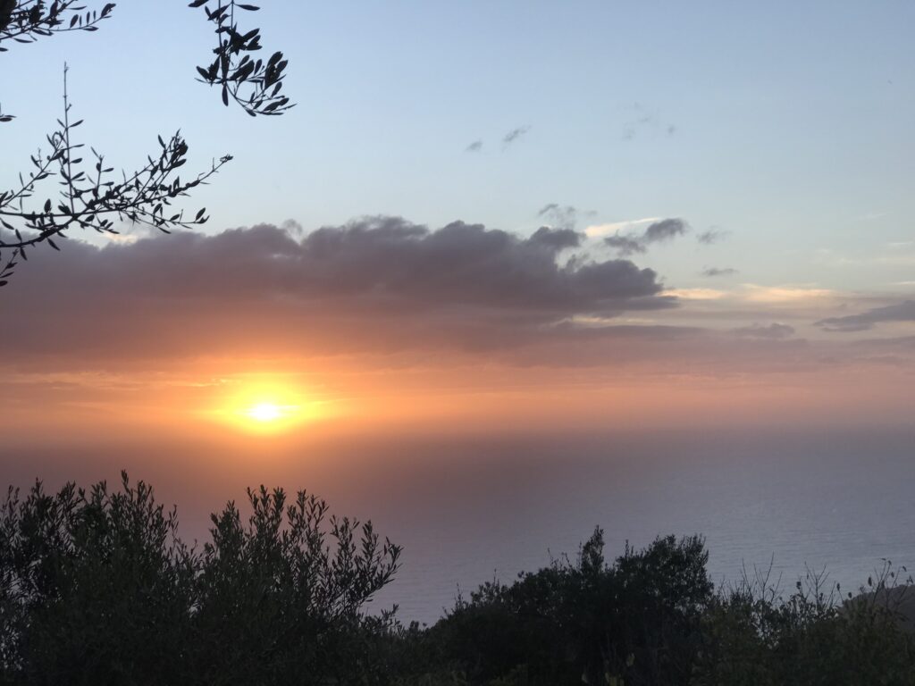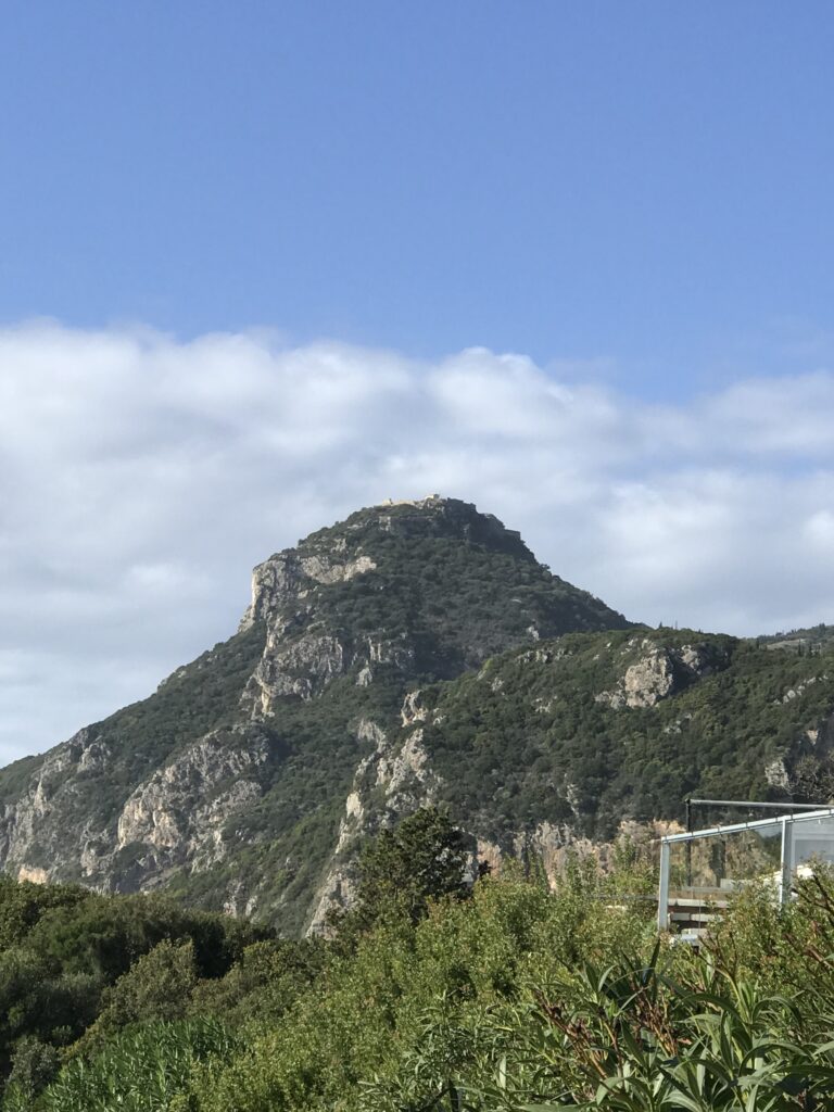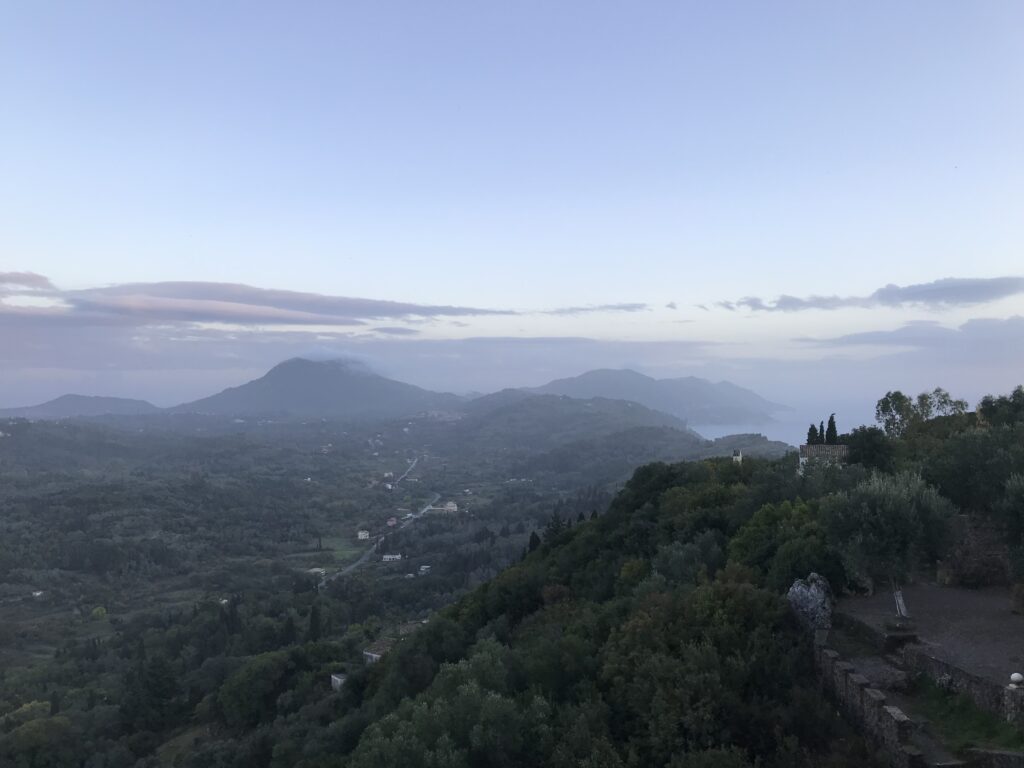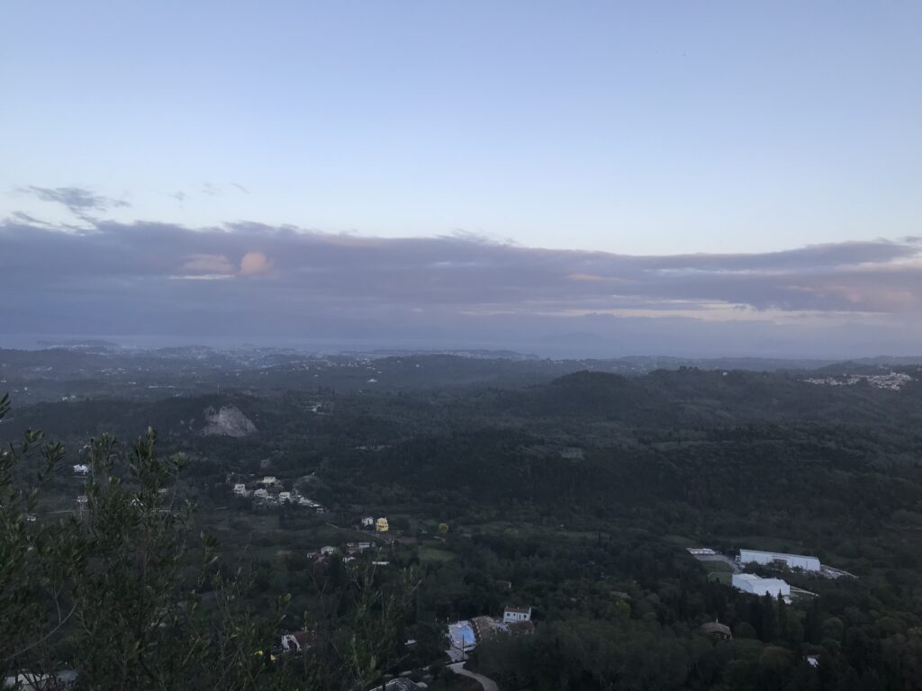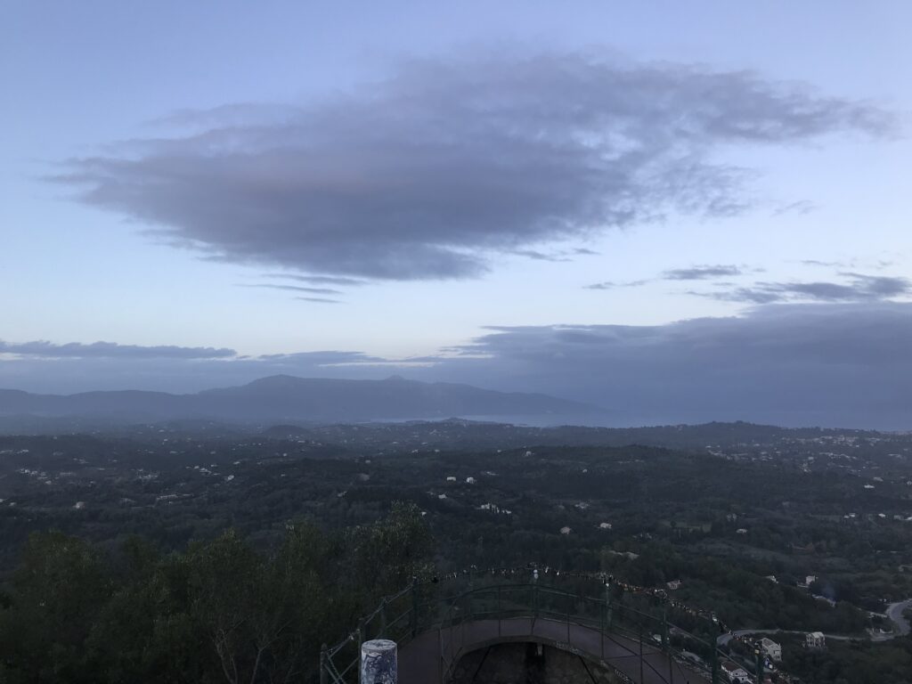 Es ist der schönste Ort um den Sonnenuntergang auf Korfu zu beobachten. Der Kaiser Wilhelm kam hierher um ihn zu betrachten. Es gibt ein Restaurant, so könnte man, wenn es offen hätte einen schönen Wein dort genießen. Aber wie hat unser Wirt gestern so schön zu mir gesagt – but Madame it‘s November. Also diese Zeit hat definitiv Vor- und Nachteile, wie eigentlich alles im Leben. Es gibt auch noch einen Aussichtsturm von dem aus man in alle Himmelsrichtungen schön auf die Insel blicken kann. Leider war es inzwischen wieder diesigere geworden. Die Sonne soll übrigens hier beim untergehen langsam über die Hügel rollen, aber das geht jetzt nicht mehr, die Sonne geht in dieser Jahreszeit schon vor den Bergen unter. Wir dachten erst wir sehen nichts, eine große Wolke versteckte die Sonne, aber dann kam sie unten langsam wieder raus, das war toll. Richtig rot wurde der gesamte Himmel nicht, hat sich aber trotzdem gelohnt.