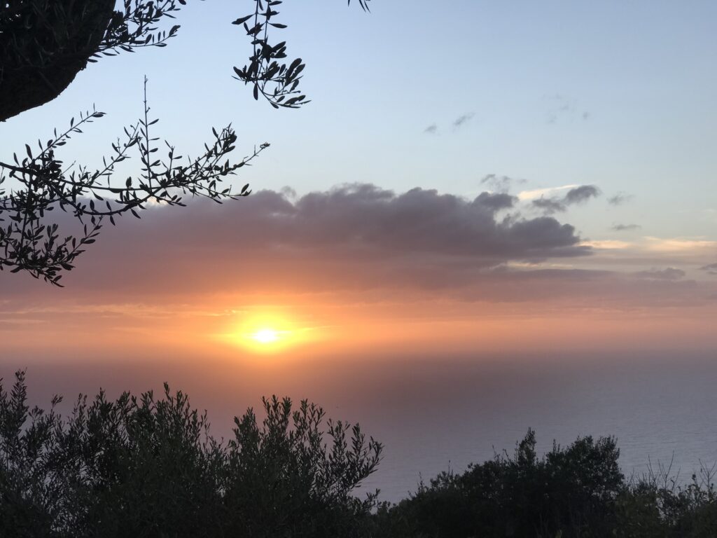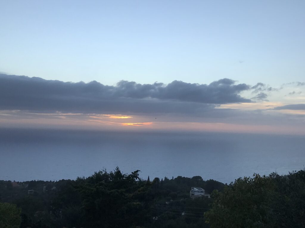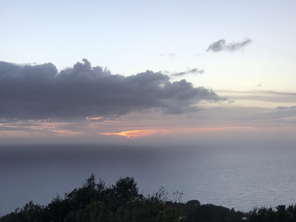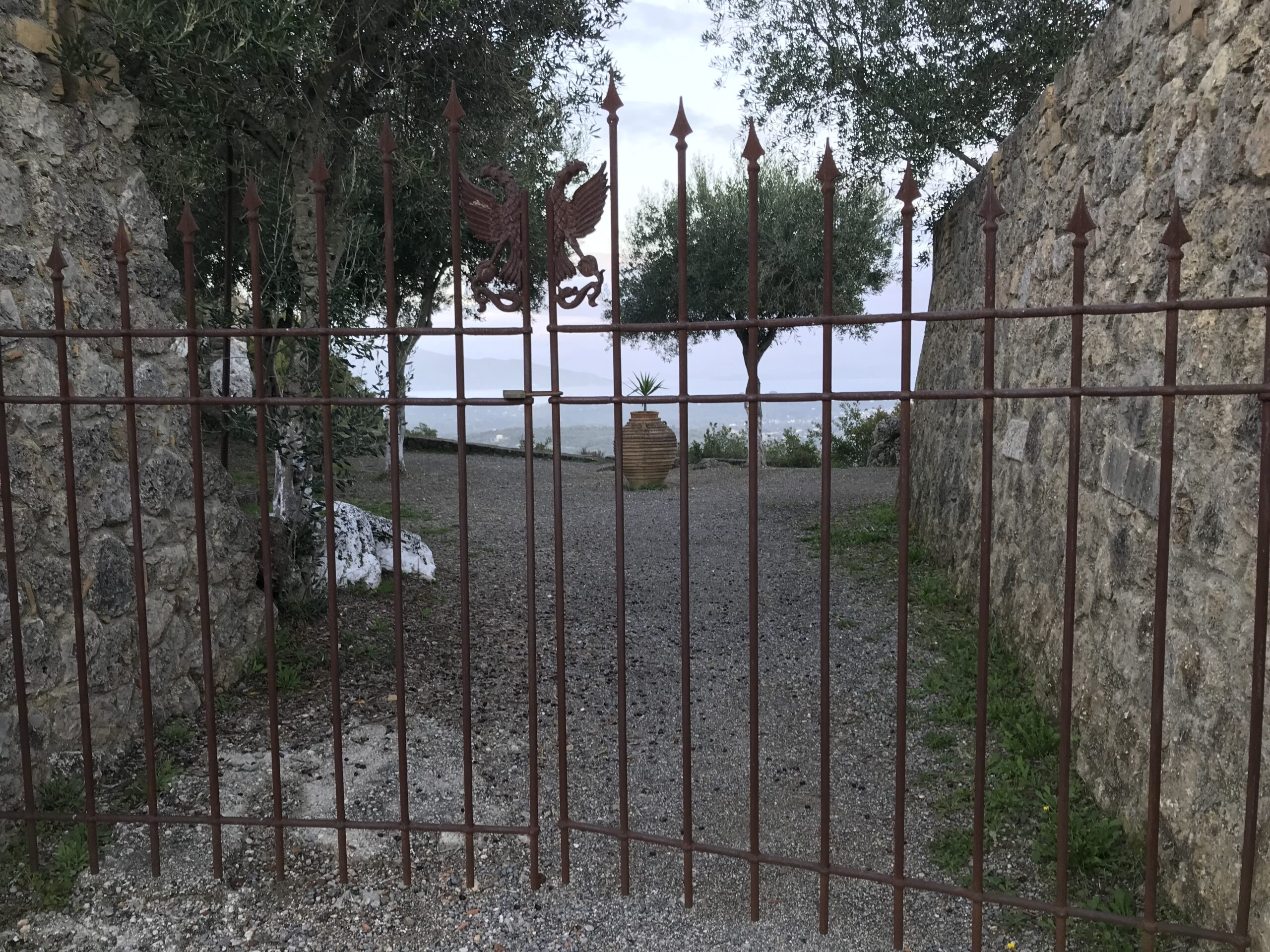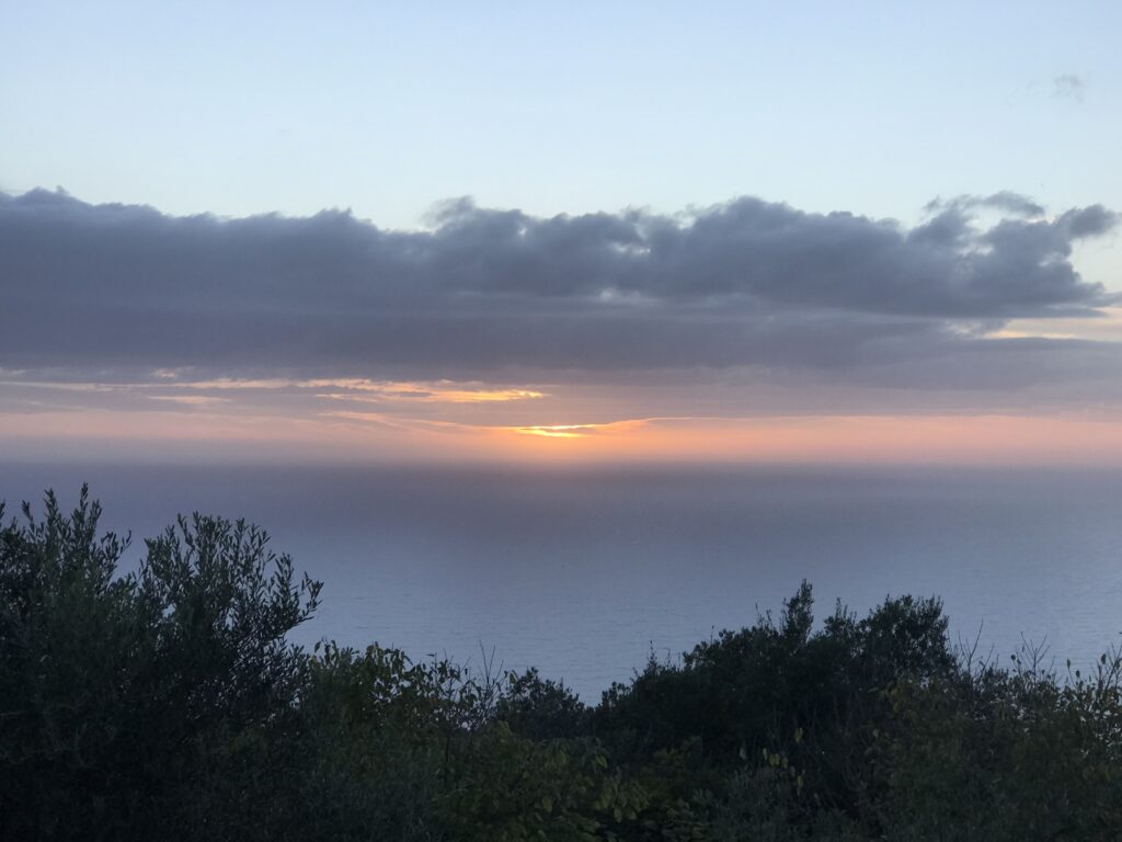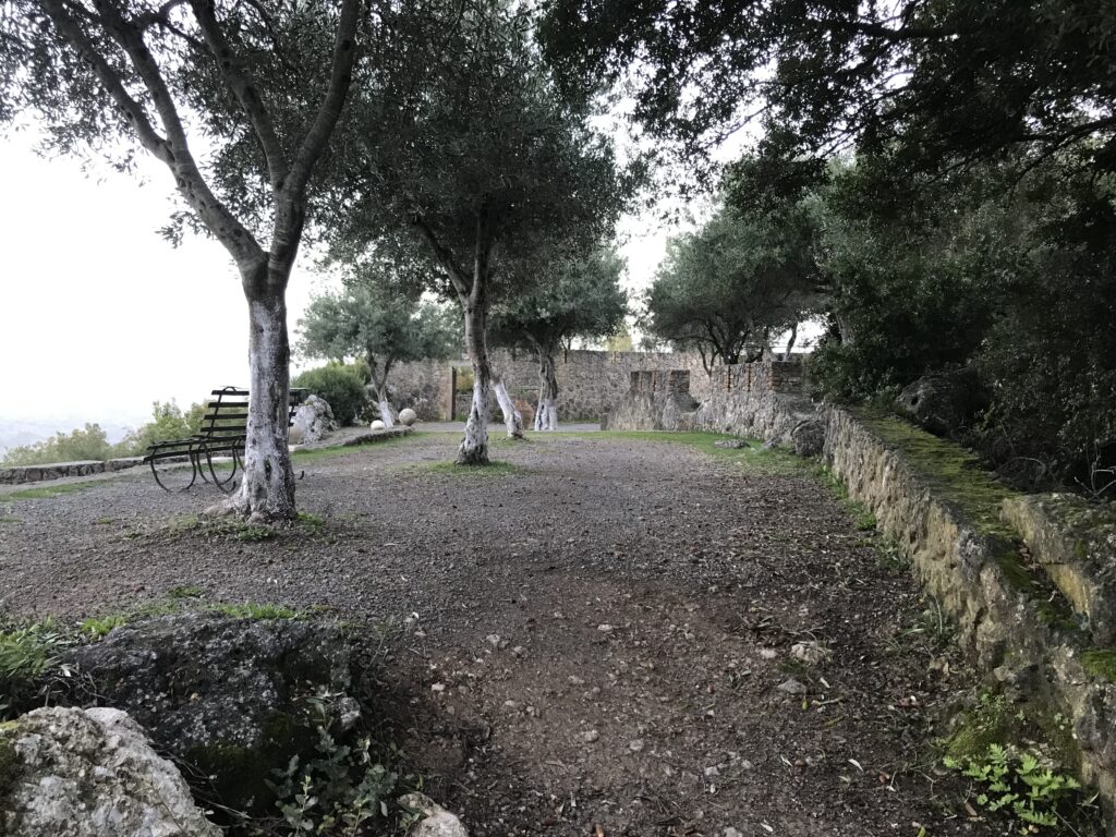 Es ist der schönste Ort um den Sonnenuntergang auf Korfu zu beobachten. Der Kaiser Wilhelm kam hierher um ihn zu betrachten. Es gibt ein Restaurant, so könnte man, wenn es offen hätte einen schönen Wein dort genießen. Aber wie hat unser Wirt gestern so schön zu mir gesagt – but Madame it‘s November. Also diese Zeit hat definitiv Vor- und Nachteile, wie eigentlich alles im Leben. Es gibt auch noch einen Aussichtsturm von dem aus man in alle Himmelsrichtungen schön auf die Insel blicken kann. Leider war es inzwischen wieder diesigere geworden. Die Sonne soll übrigens hier beim untergehen langsam über die Hügel rollen, aber das geht jetzt nicht mehr, die Sonne geht in dieser Jahreszeit schon vor den Bergen unter. Wir dachten erst wir sehen nichts, eine große Wolke versteckte die Sonne, aber dann kam sie unten langsam wieder raus, das war toll. Richtig rot wurde der gesamte Himmel nicht, hat sich aber trotzdem gelohnt.
