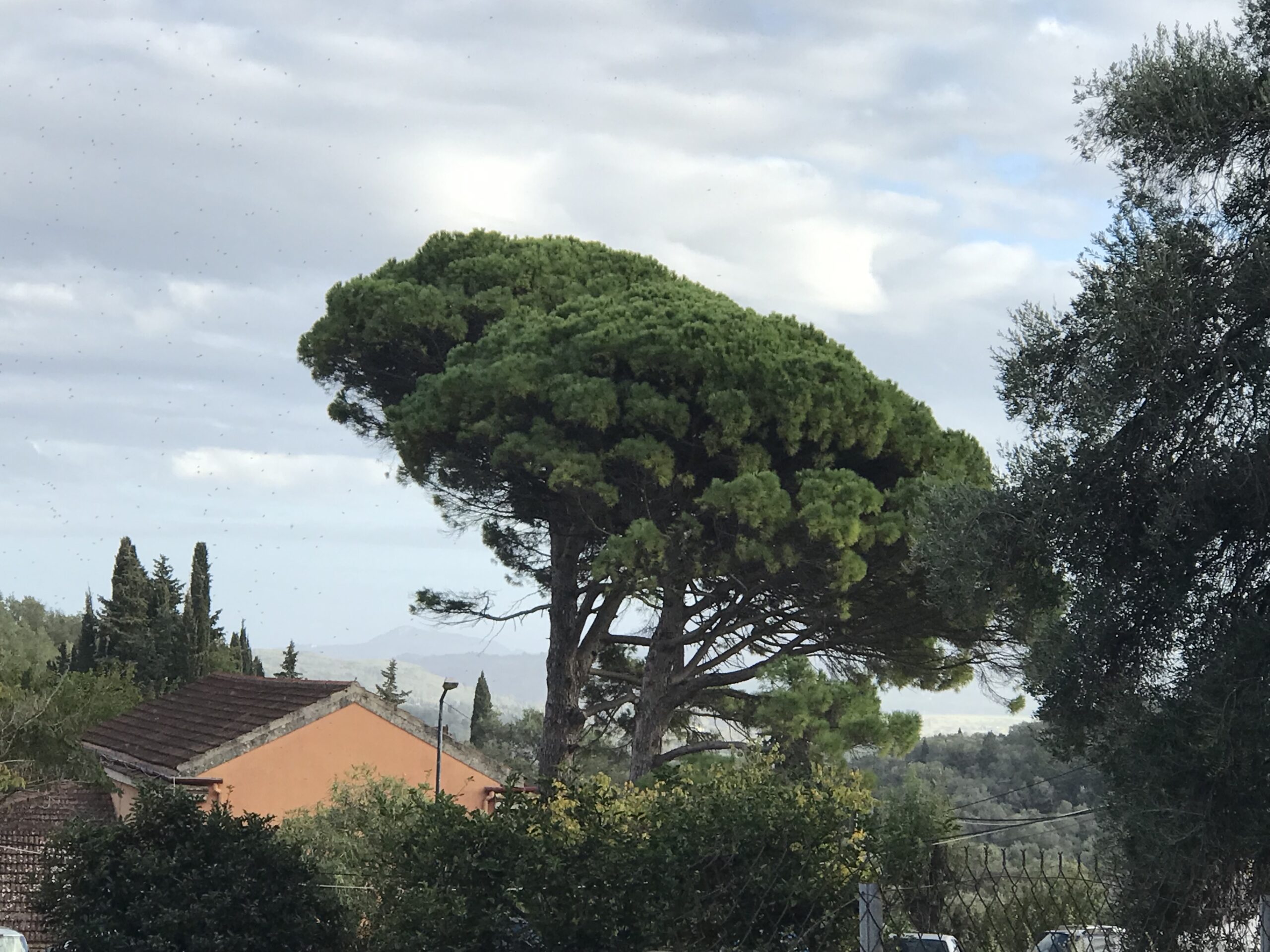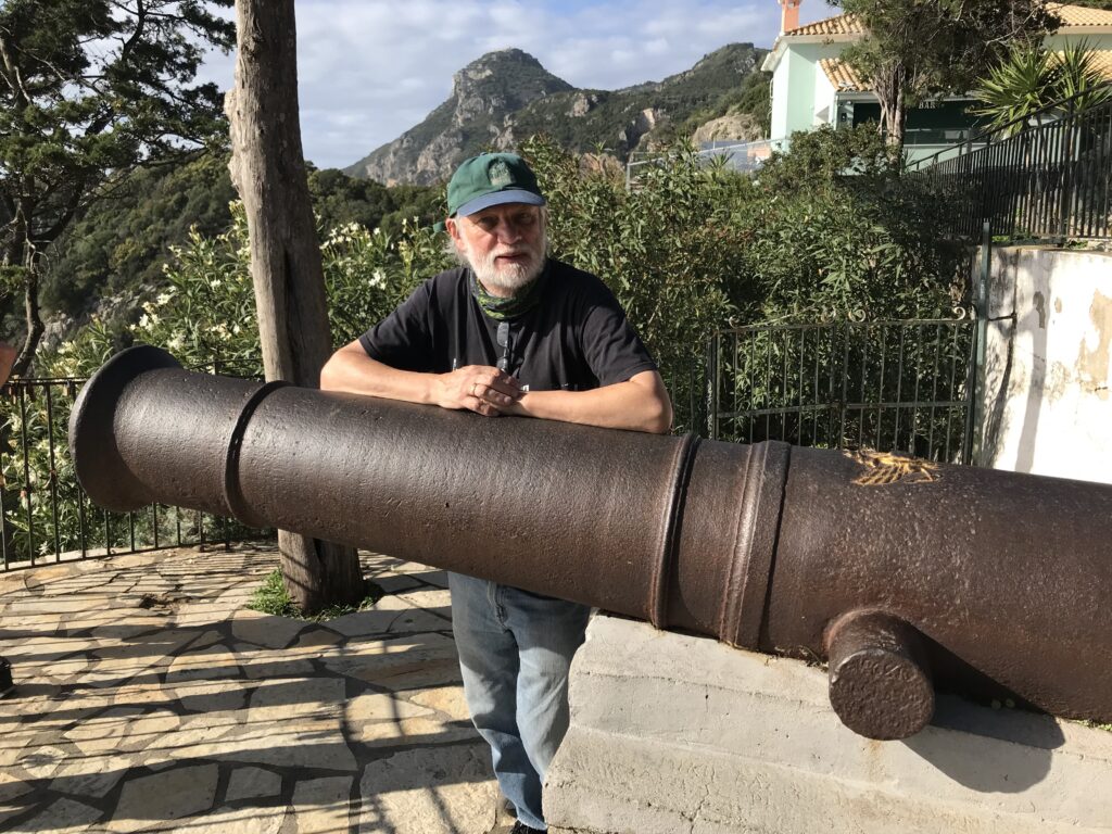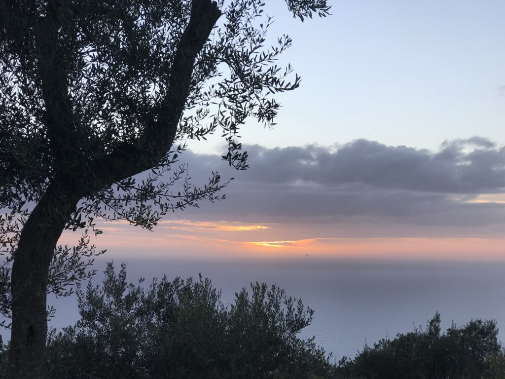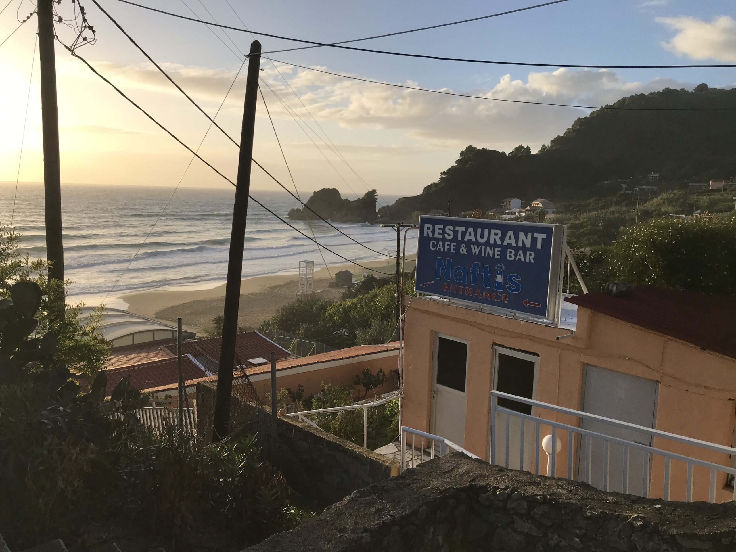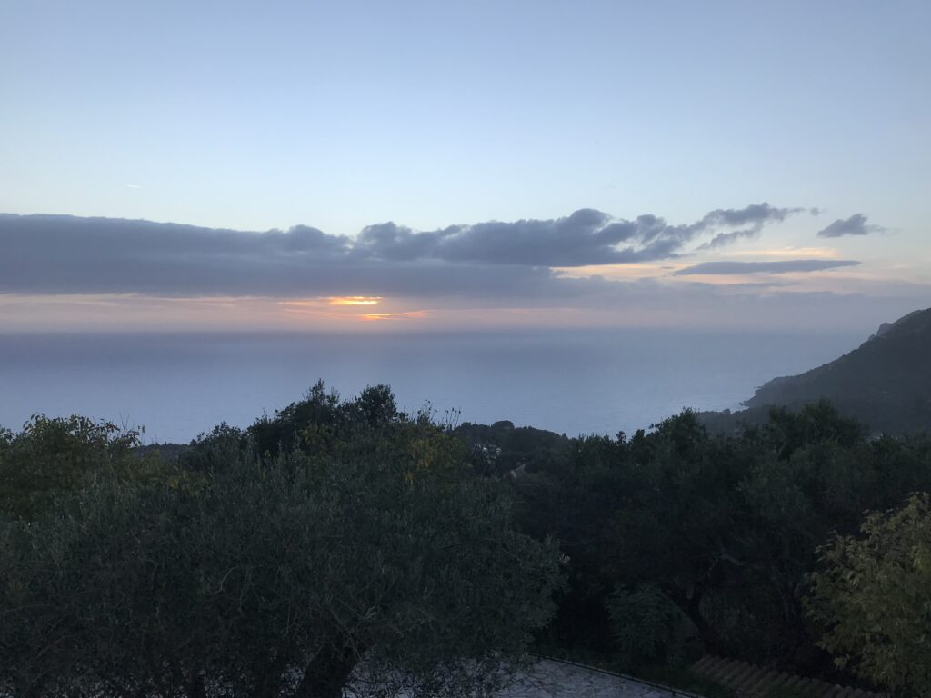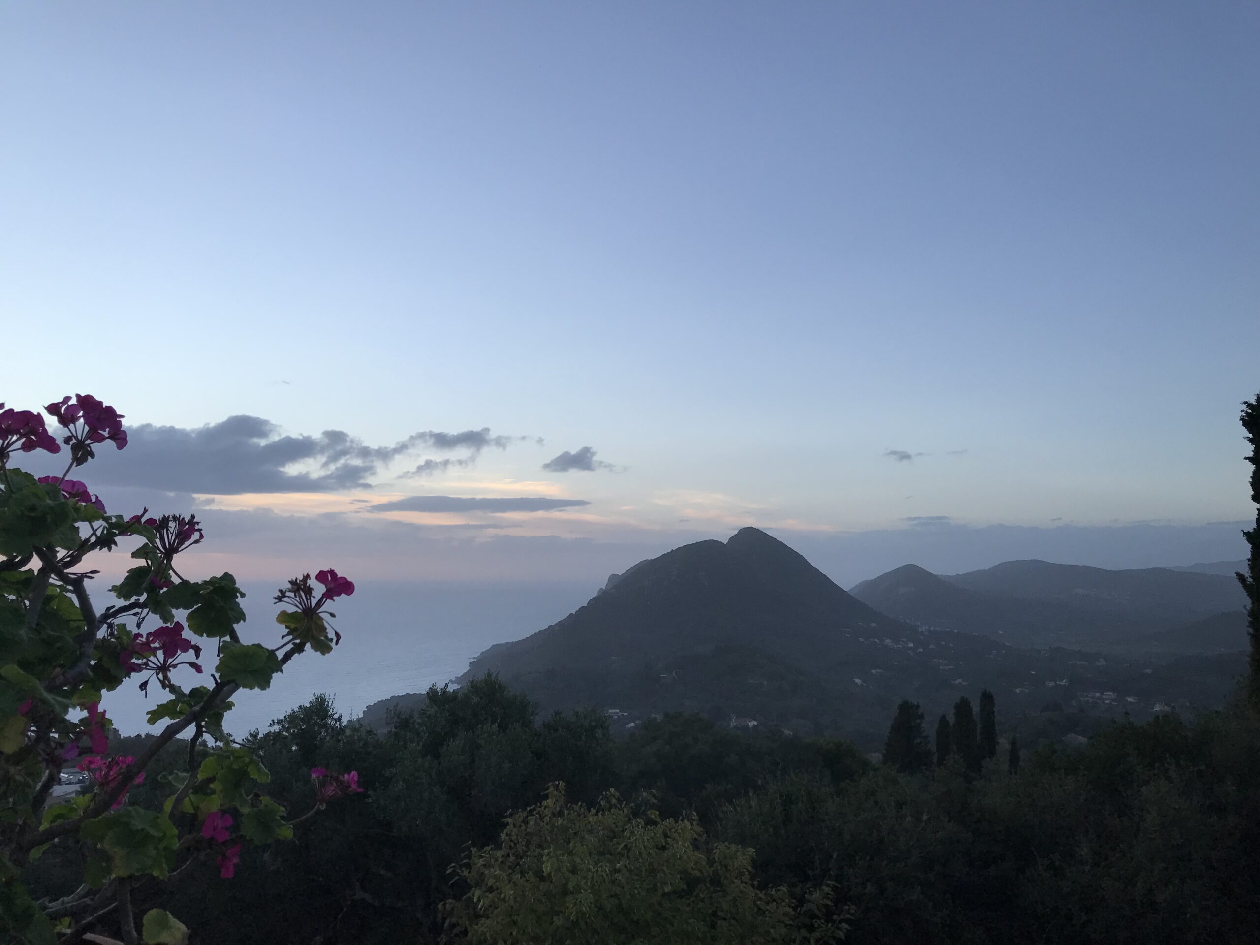 Es ist der schönste Ort um den Sonnenuntergang auf Korfu zu beobachten. Der Kaiser Wilhelm kam hierher um ihn zu betrachten. Es gibt ein Restaurant, so könnte man, wenn es offen hätte einen schönen Wein dort genießen. Aber wie hat unser Wirt gestern so schön zu mir gesagt – but Madame it‘s November. Also diese Zeit hat definitiv Vor- und Nachteile, wie eigentlich alles im Leben. Es gibt auch noch einen Aussichtsturm von dem aus man in alle Himmelsrichtungen schön auf die Insel blicken kann. Leider war es inzwischen wieder diesigere geworden. Die Sonne soll übrigens hier beim untergehen langsam über die Hügel rollen, aber das geht jetzt nicht mehr, die Sonne geht in dieser Jahreszeit schon vor den Bergen unter. Wir dachten erst wir sehen nichts, eine große Wolke versteckte die Sonne, aber dann kam sie unten langsam wieder raus, das war toll. Richtig rot wurde der gesamte Himmel nicht, hat sich aber trotzdem gelohnt.
