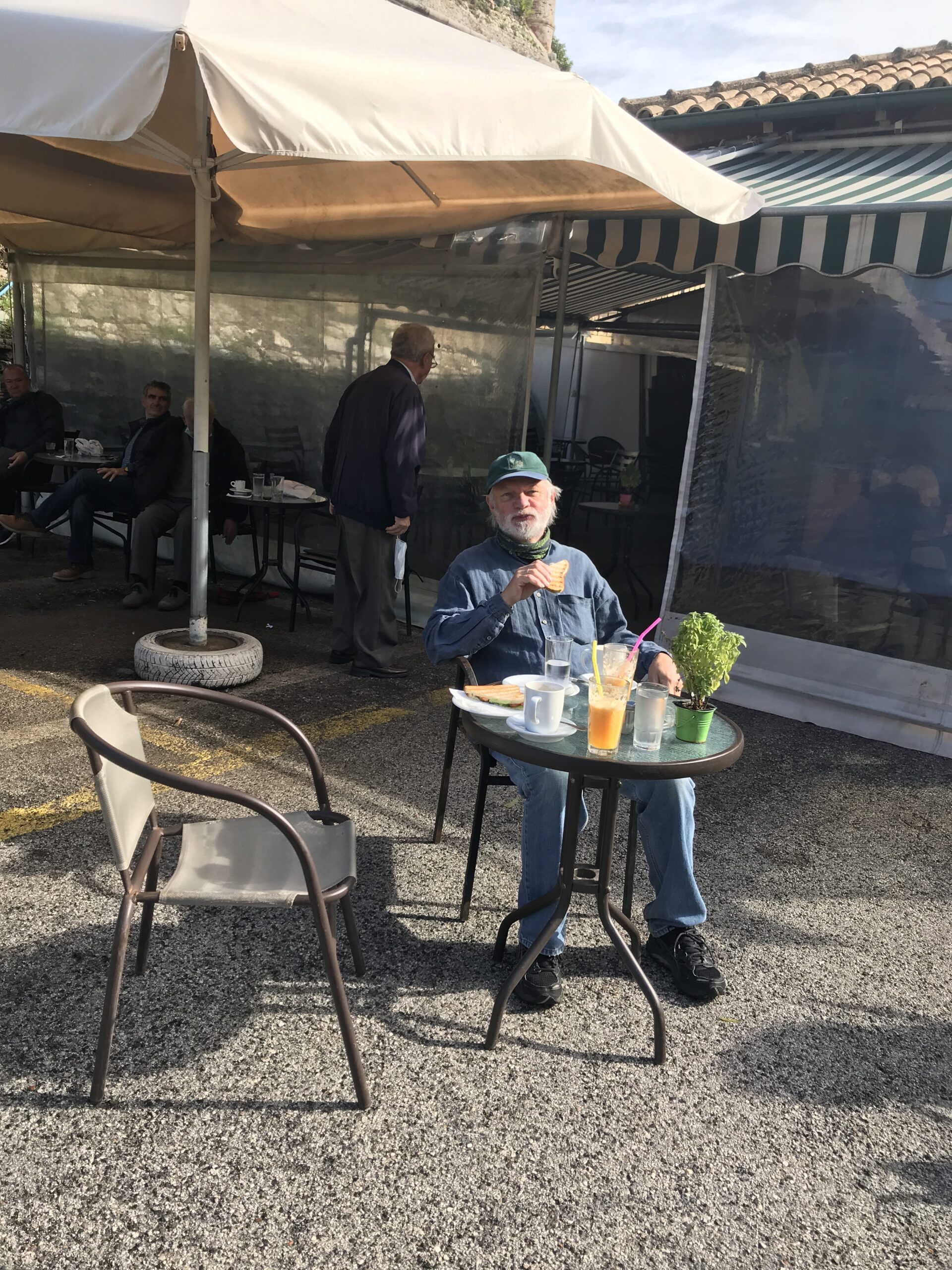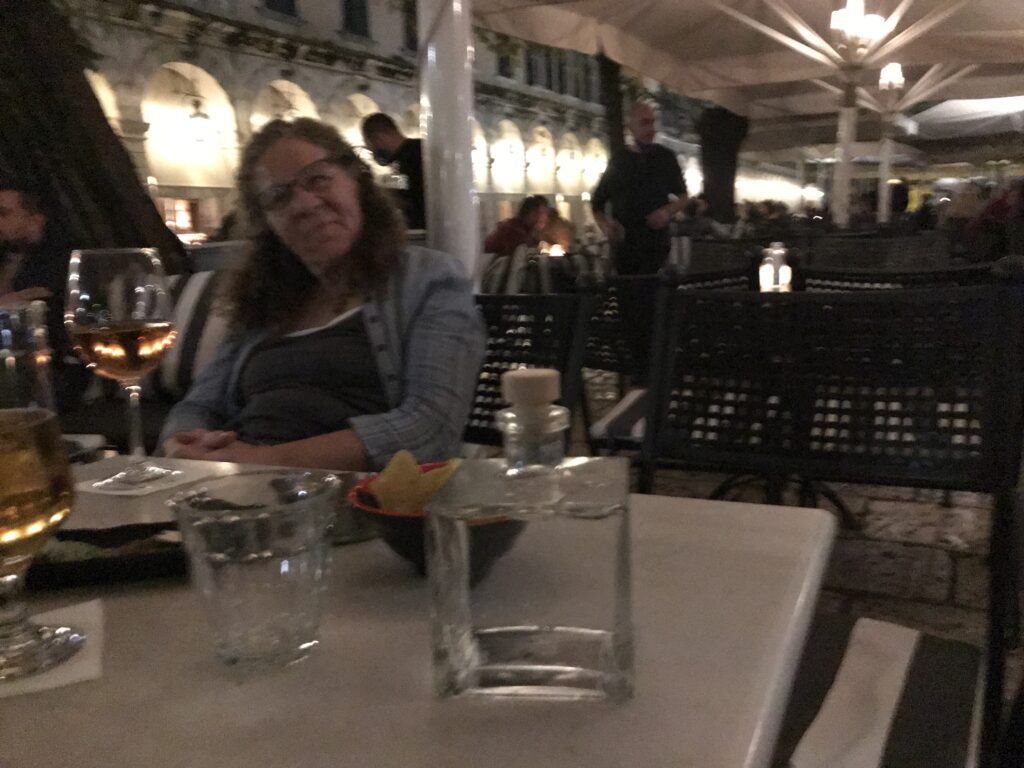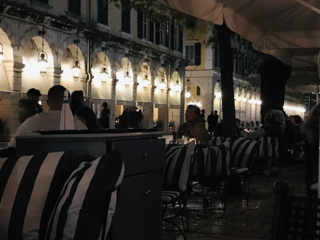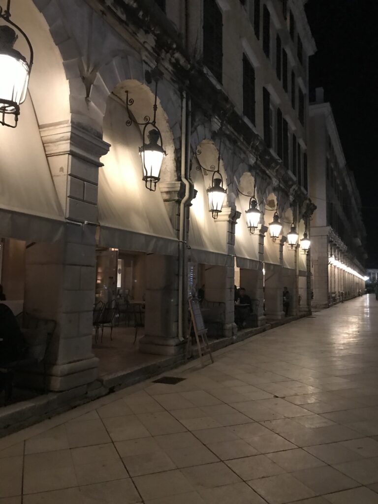 Zurück in der Stadt nahmen wir mit einem Glas Wein und Burkhard mit Bier – bei 20 Grad um 20:30 Uhr – Abschied von Korfu am Hauptplatz mit Blick auf die schönen Arkaden. Das witzige war, sie hatten die gleichen Gartenstühle wie wir, so konnten. Wir uns dann richtig zuhause fühlen.