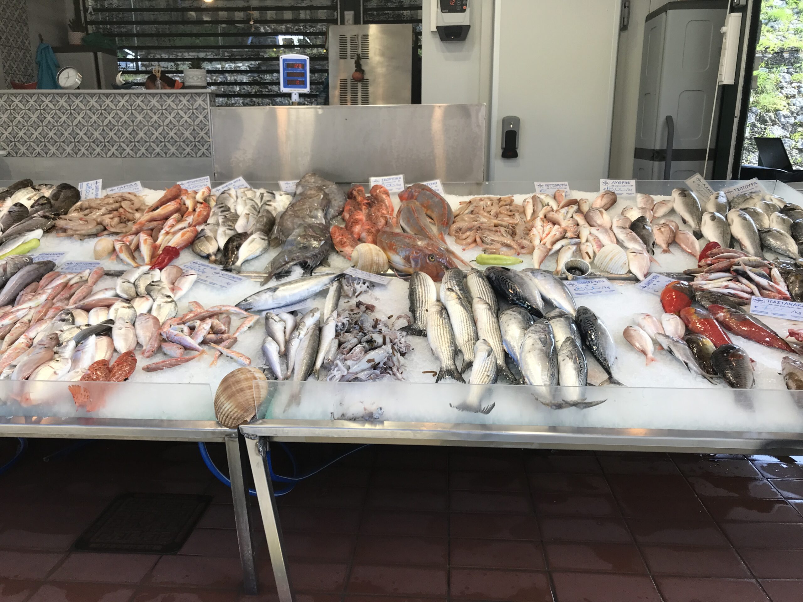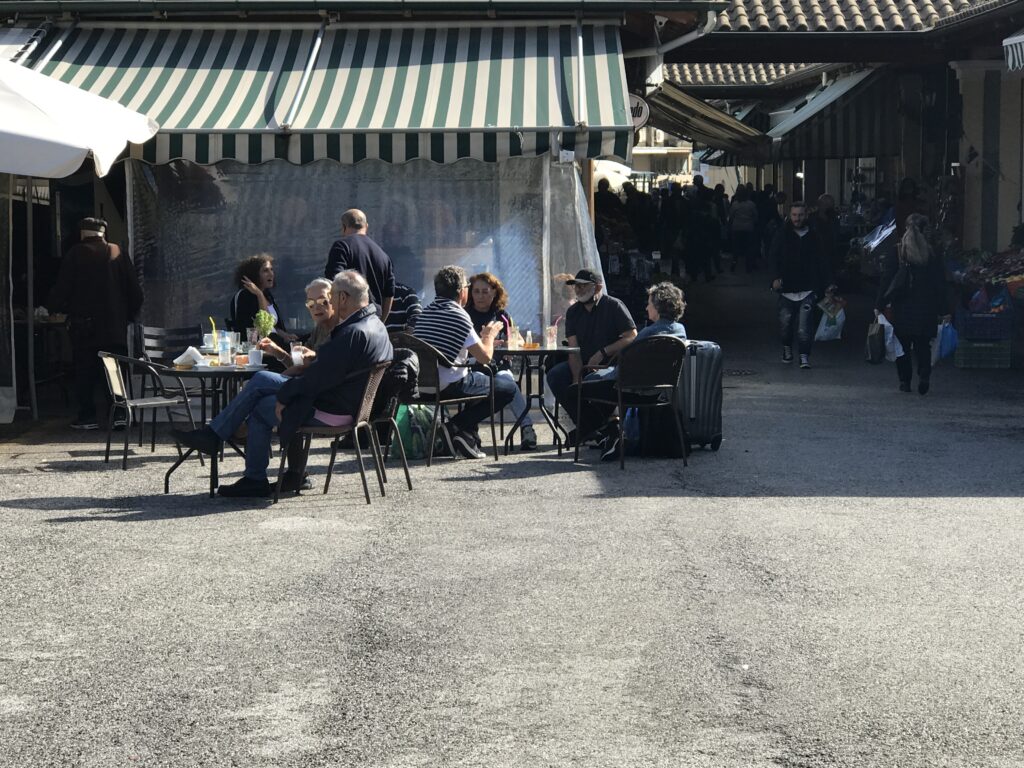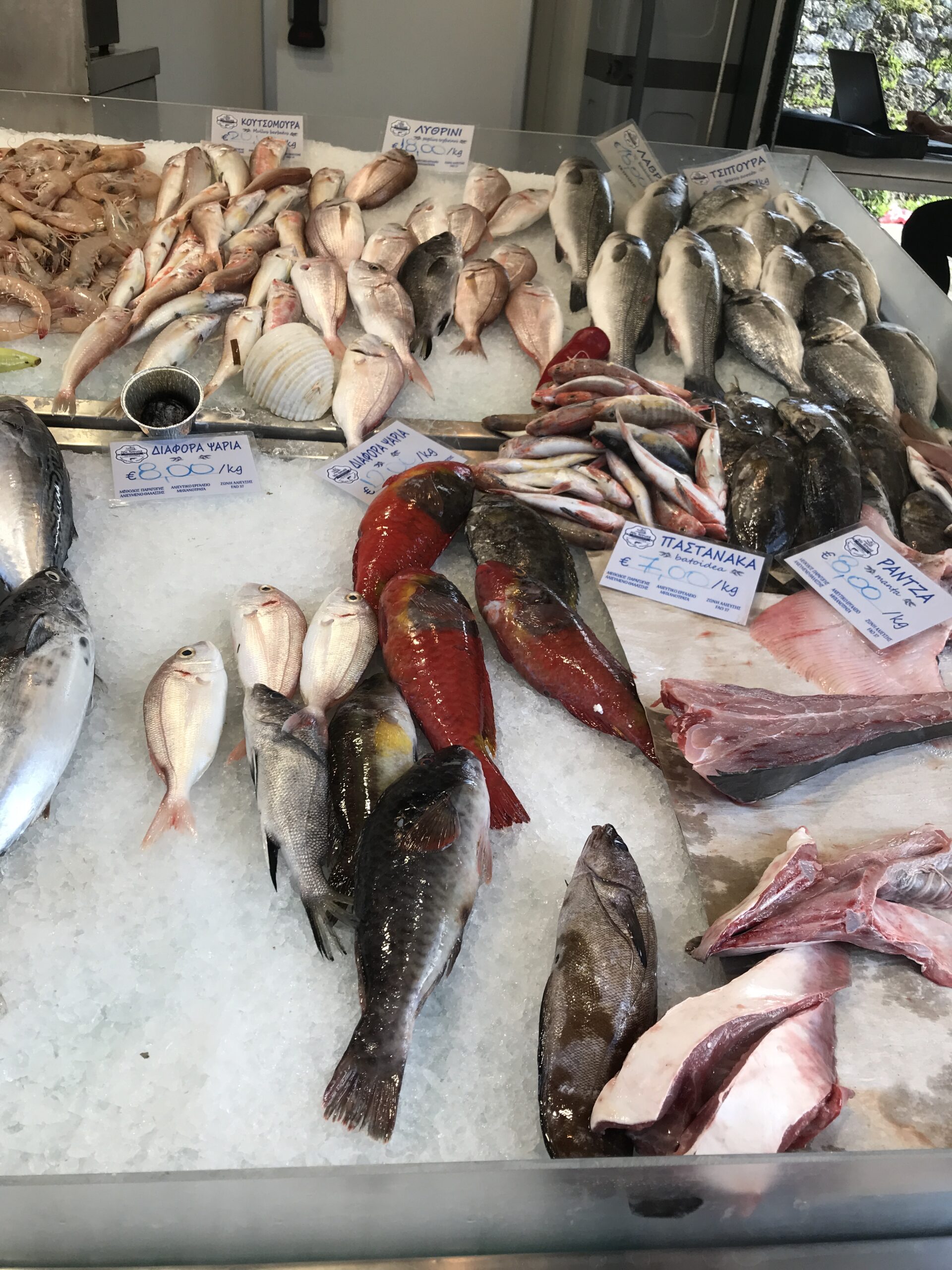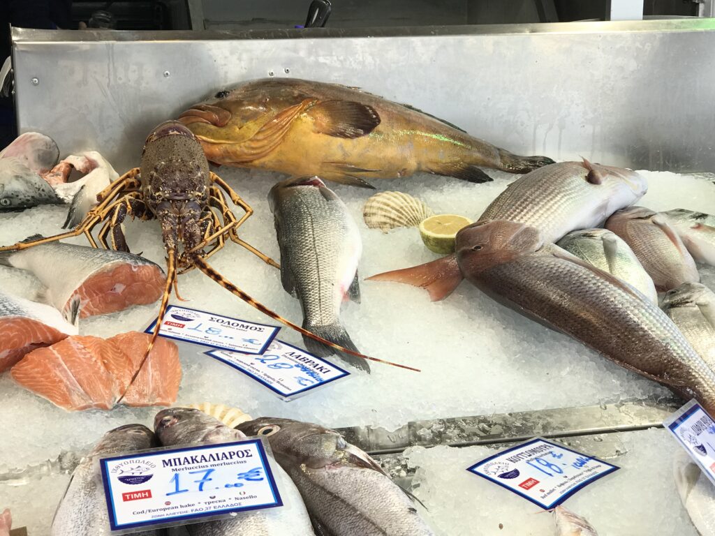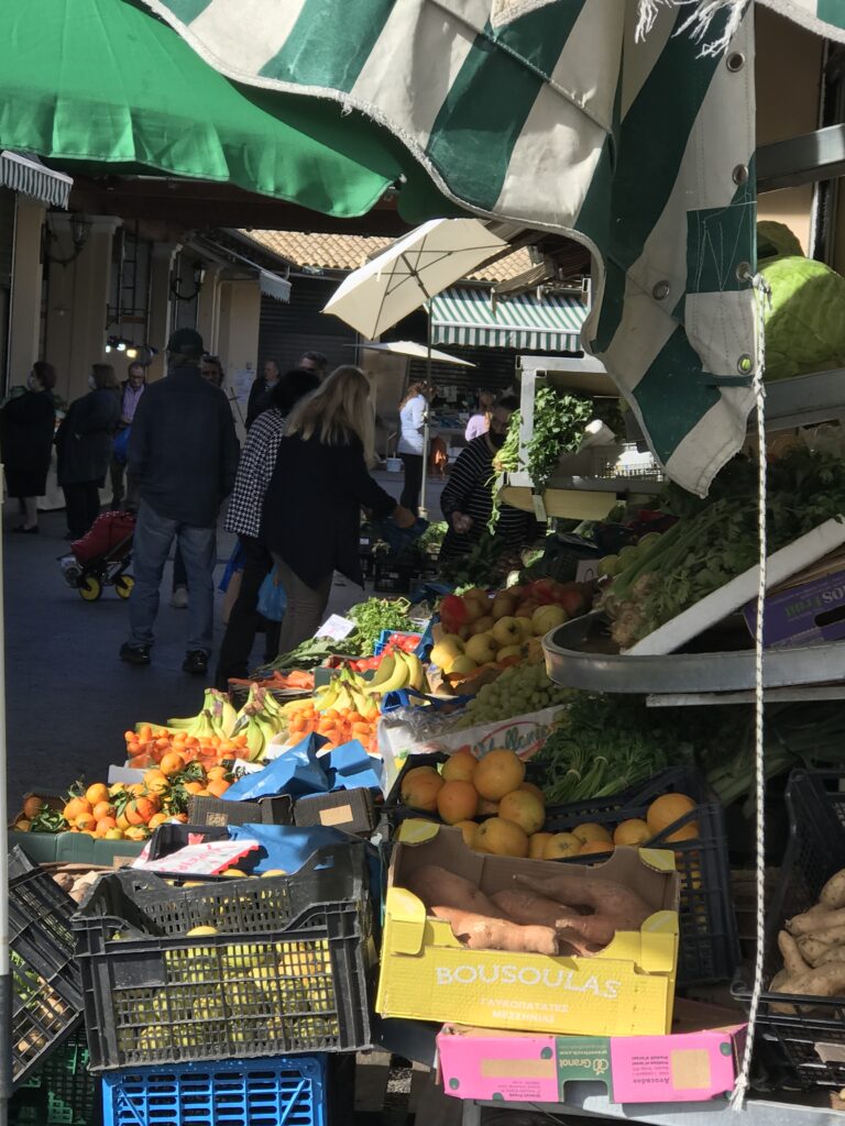 Erstmal haben wir etwas länger geschlafen, denn es war ja viel Regen bis Mittag angesagt. Dann die Überraschung – unser Museumsbesuch musste ausfallen – mangels Regen. Als ich um 09:15 Uhr den Laden öffnete, war es zwar nass – kein Regen mehr – und die Sonne ließ sich schon blicken. So begannen wir den heutigen Tag mit einem Spaziergang durch die Fußgängerzone, die ja genau bei uns am Hotel beginnt zum grünen Markt inkl. Fischmarkt. Wir frühstückten also zwischen den Korfioten. Wahnsinn, was sie da für Fische anboten, solche hatten wir noch nicht gesehen.