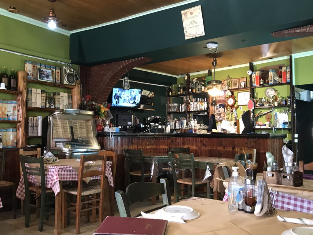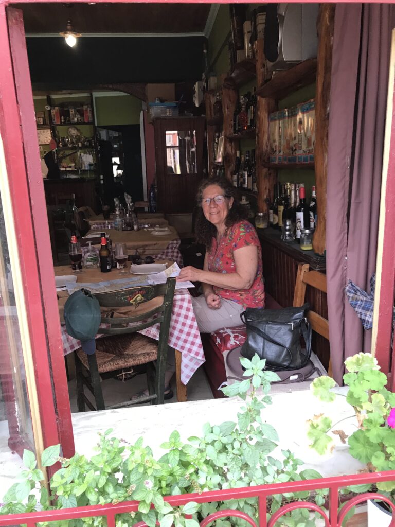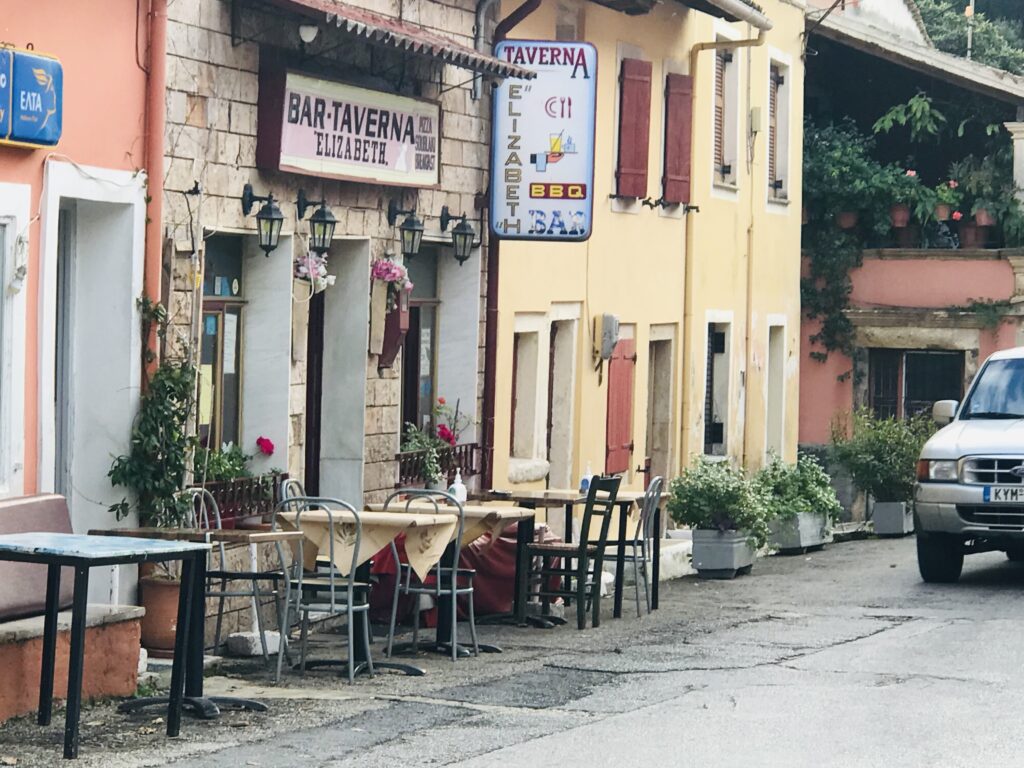 Wir kamen einer Essensempfehlung des Reiseführers nach, hatten Bedenken, dass die Taverna Elizabeth bestimmt schon geschlossen hat, aber riskierten diesen Umweg. Wir hatten Glück und waren einfach nur hin und weg von dem guten Essen. Es werden traditionell korfotische Gerichte nach den alten Rezepten der Oma gekocht. Wir entschieden uns für das sofrito, ein in Essig und Knoblauch marinierter, in Weinsoße und Kräutern geschmorter Kalbsbraten. Sie fragte ob wir Potatoes dazu wollten, was wir bejahten, es waren dann aber selbstgemachte Pommes – gut Kartoffeln sind es auch, aber das passte nicht so ganz. Das Fleisch und vor allem die Soße waren so lecker, dass wir den letzten Tropfen Soße mit dem Brot, das wir zu unserem Kraut- und Karottensalat erhielten, vom Teller nahmen. Das registrierte die Schwiegertochter der Gründerin Elizabeth ( vor 60 Jahren), und freute sich sehr. So bekamen wir noch einen kostenlosen Nachtisch – griechischen Joghurt mit Honig und Äpfeln und kandierten Aprikosen. Ich fragte sie nach einem kleinen Löffel, wir hatten nur Kuchengabeln bekommen und sie lachte aus vollem Halse. Ich löffelte alles so gut es ging aus und hatte ihr Herz erobert. Wir unterhielten uns auch mit ihr, denn sie wollte wissen wo wir her sind und ob wir morgen abreisen. Wir erklärten ihr unsere Tour mit dem Auto mit dem Ziel des Besuches meines Neffen mit Freundin in Athen. Sie war begeistert und meinte, das sei doch gefährlich durch die ganzen Länder zu reisen, was wir verneinten, es gab keinerlei Probleme. Am Ende meinte sie hoffentlich sehen wir uns einmal wieder, sie fasste sich mehrmals an ihr Herz, bedankte sich und wünschte uns alles Gute. Wir haben jetzt schon so viele, sehr freundliche und herzliche Menschen kennengelernt – einfach nur toll. Vielleicht erzähle ich zu viel vom Essen, aber wir sind jetzt 4 Tage in Griechenland und haben jeden Tag so super gut gegessen, dass wir ganz begeistert davon sind.