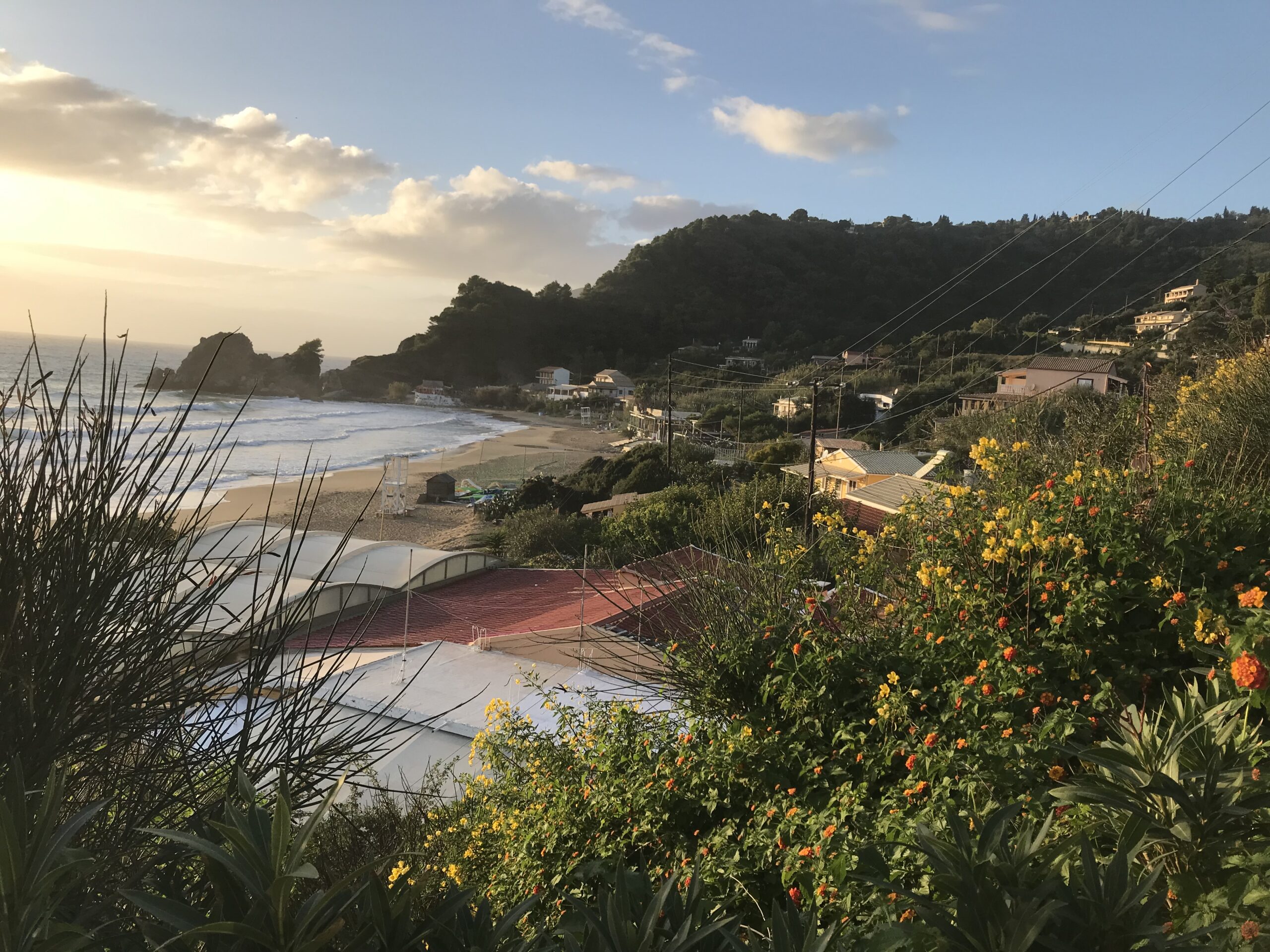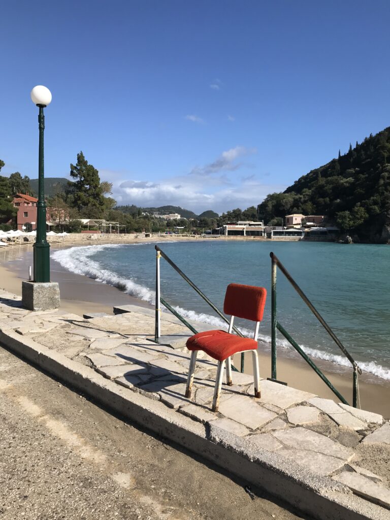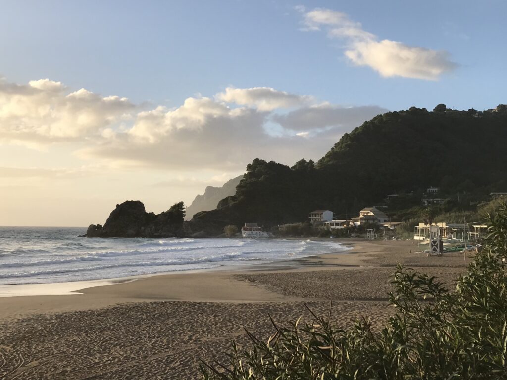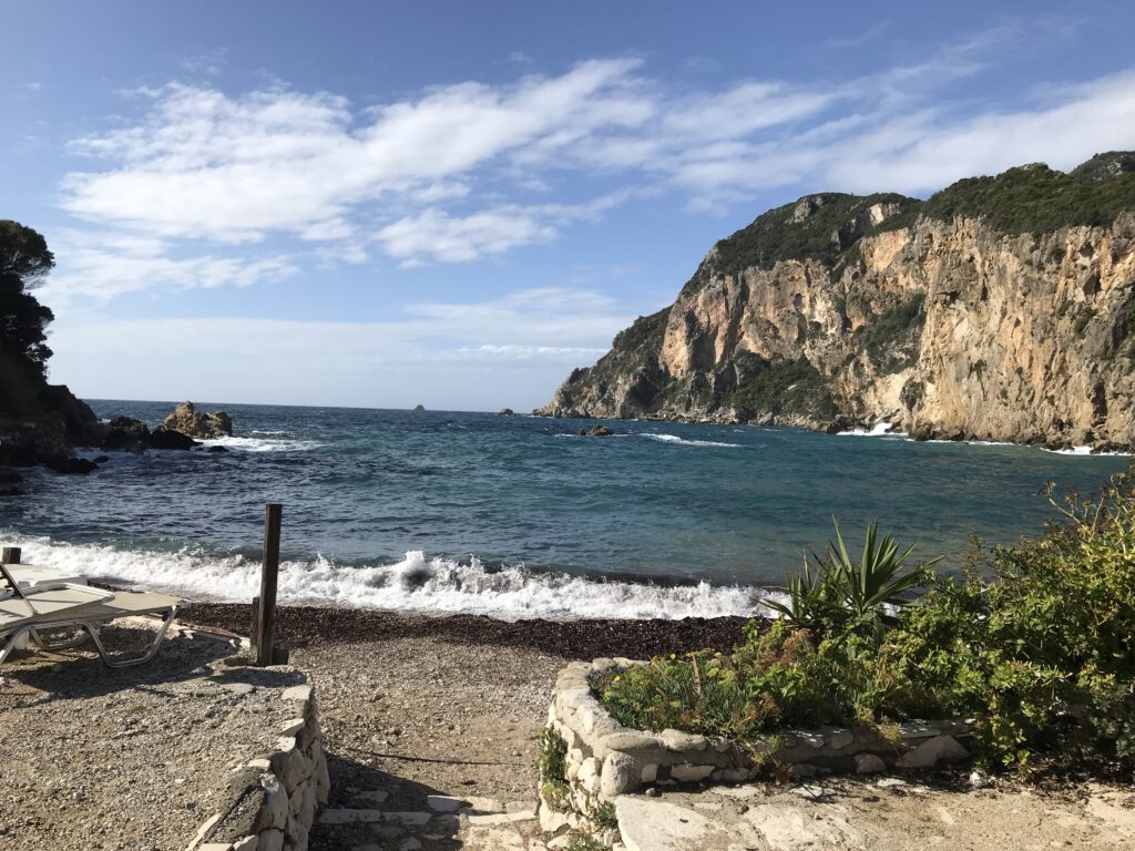 Lt. Reiseführer gilt er vielen Korfioten als schönster Ort der Insel. Ich kann dem zustimmen, er ist landschaftlich wunderschön gelegen. Der Ort liegt an zwei gegenüberliegenden Buchten zwischen wirklich eindrucksvollen Felsküsten. Im Sommer soll hier täglich Marktatmosphäre auf den Straßen herrschen, wir aber konnten die Ruhe mit fast keinen Menschen genießen – das war sehr angenehm und dazu hatten wir am Strand im Schatten 23 Grad und ich war mit den Füßen im noch angenehm warmen Wasser.