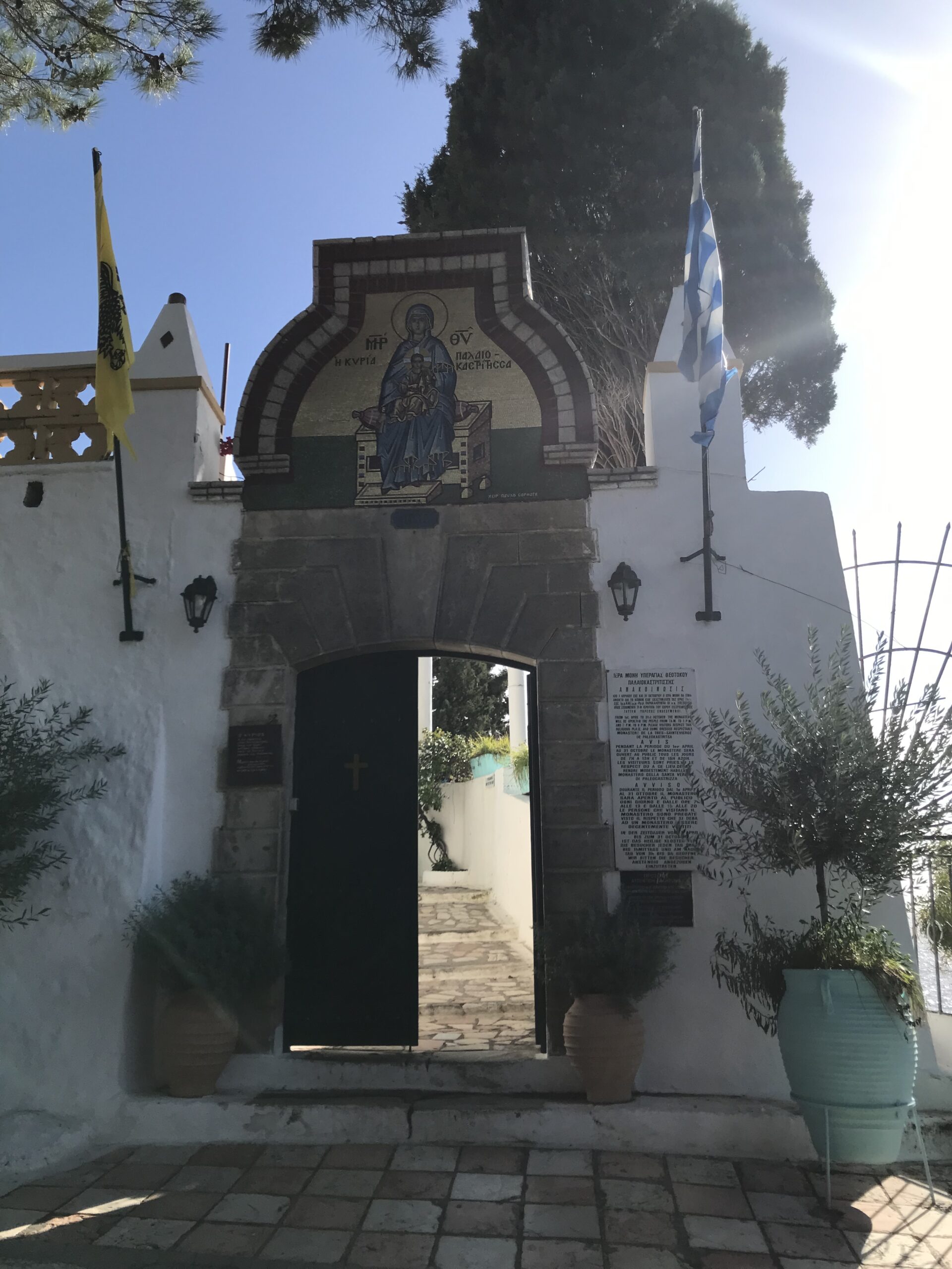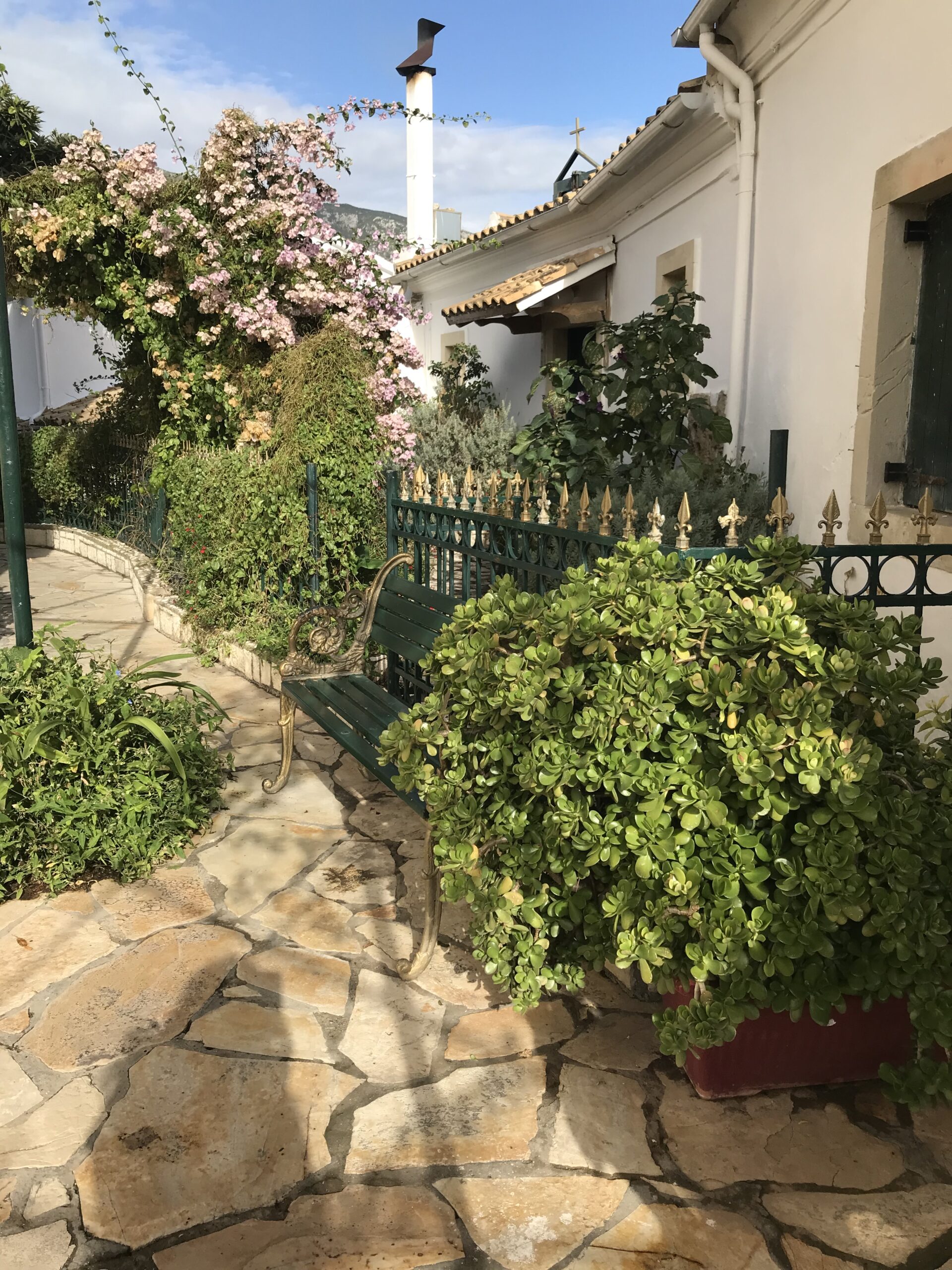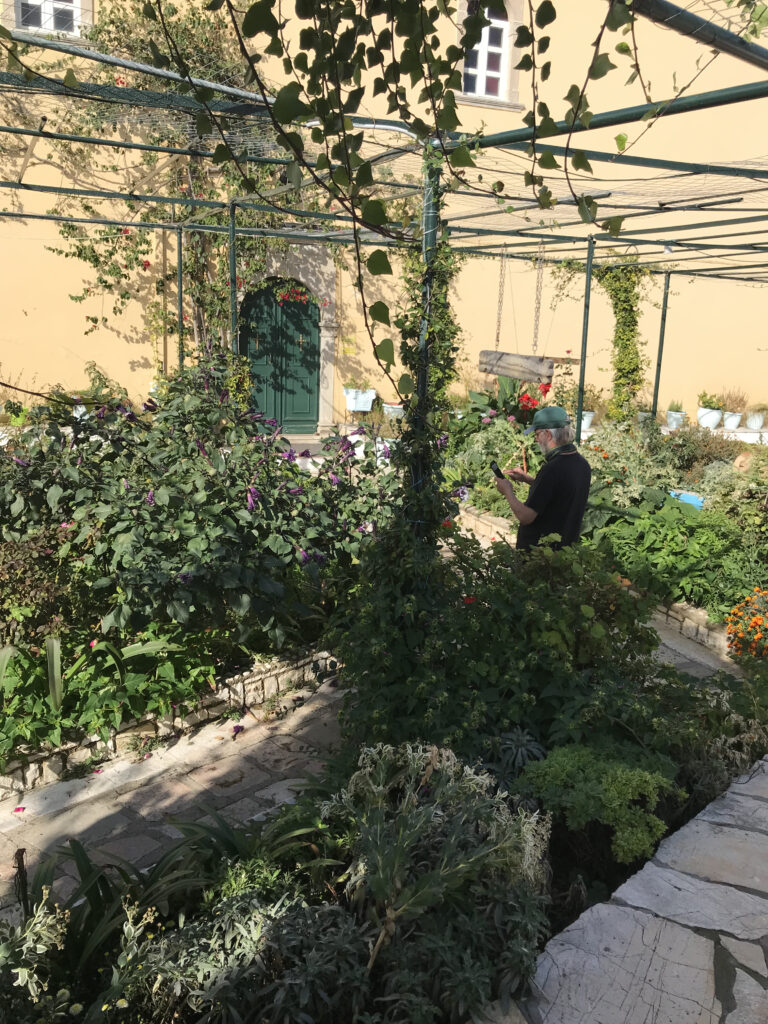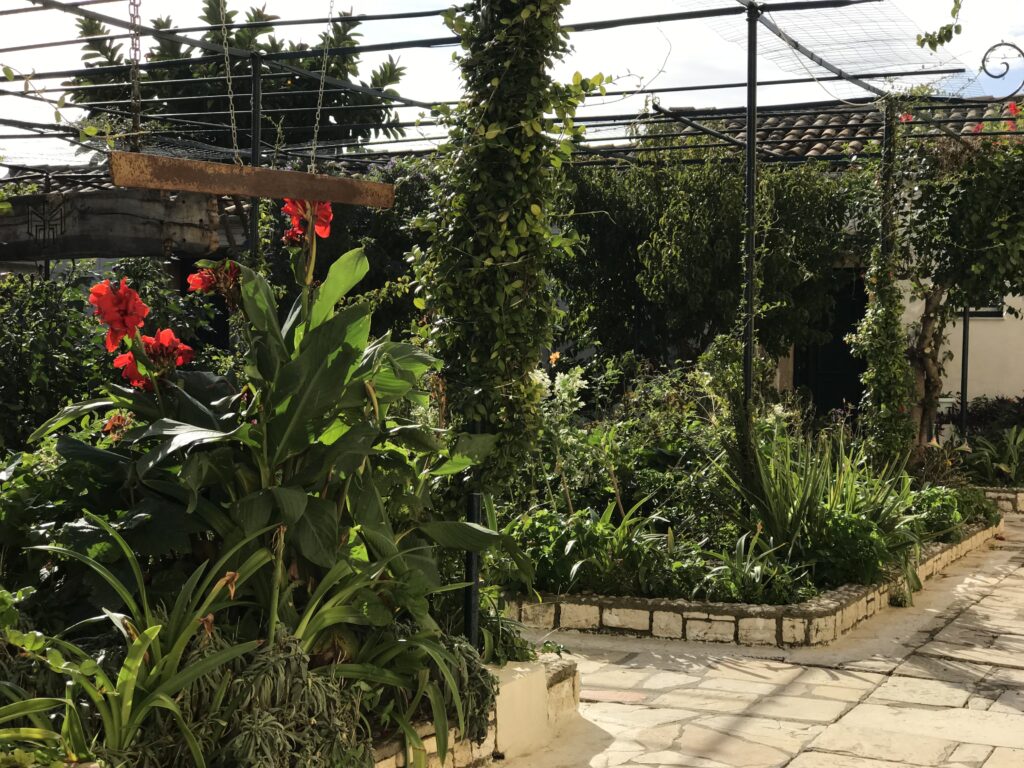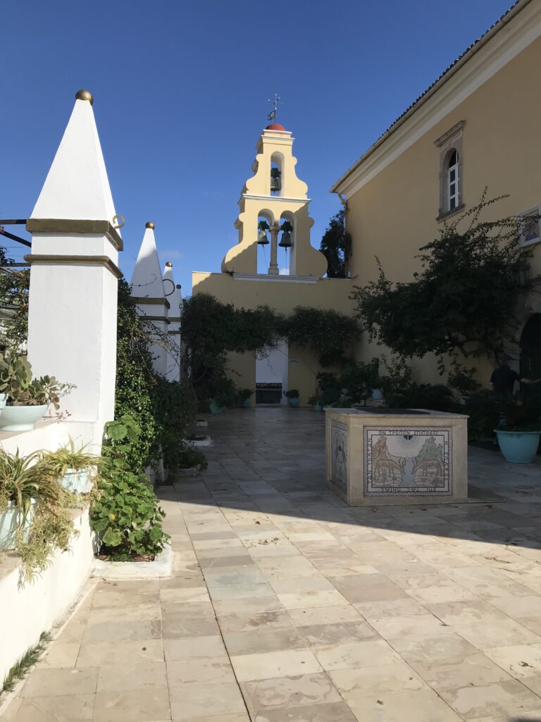 Sehr neugierig waren wir auf die Blumenpracht hinter weißen Klostermauern auf dem steilen Bergabhang und wir wurden nicht enttäuscht – die Serpentinen haben sich gelohnt. Laut Reiseführer ohne Zweifel das schönste Konvent auf Korfu.