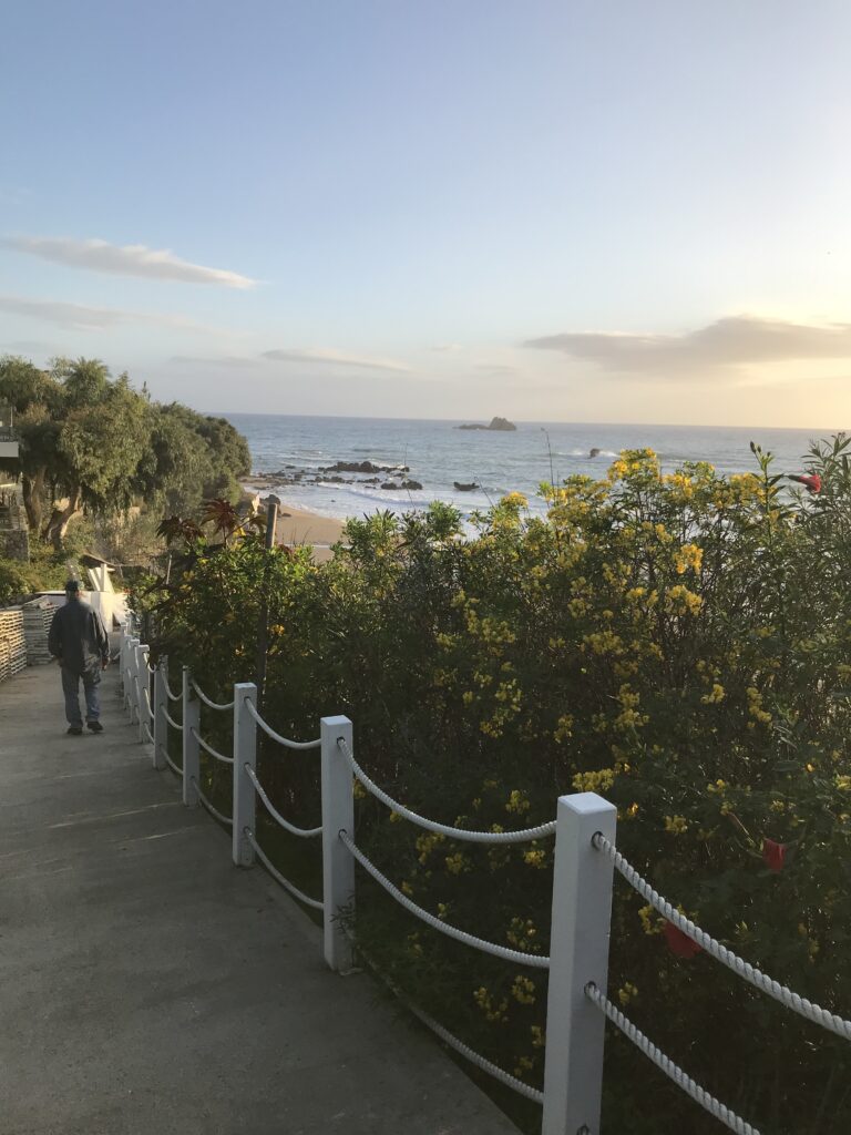 Ein kleiner Ort am Hang, Treffpunkt der alternativen Szene. Wir wollten zum 2 km unterhalb liegendem Strand. Oh jeh, war das eine Straße, eigentlich kann man es nicht so nennen. Eine schmale Piste mit vielen engen Kurven und vielen Schlaglöchern. Es war kein Schild und nichts und plötzlich standen wir an der Holzterrasse mit Liegestühlen eines großen Terrassenhotels, das sie dann hier inzwischen hingebaut haben. Das war nicht schön, rückwärts wieder steil hoch, das war keine Option. Umdrehen aber eigentlich auch nicht alles viel zu eng. Aber Burkhard hat es gut gemeistert, ich war ausgestiegen und hatte gewunken. Zunächst musste er aber ein bisschen auf die Holzterrasse fahren – ein Glück, dass das Hotel geschlossen und kein Mensch weit und breit war. Die Kupplung stank wieder ein bisschen, war ja vor kurzem schon einmal, wir hoffen sie hält durch.