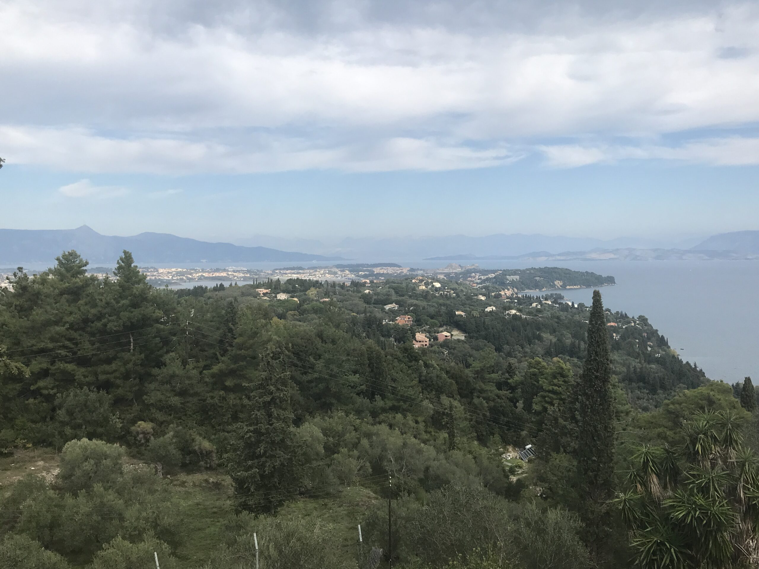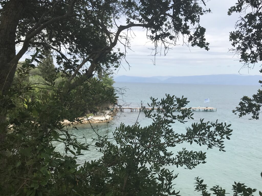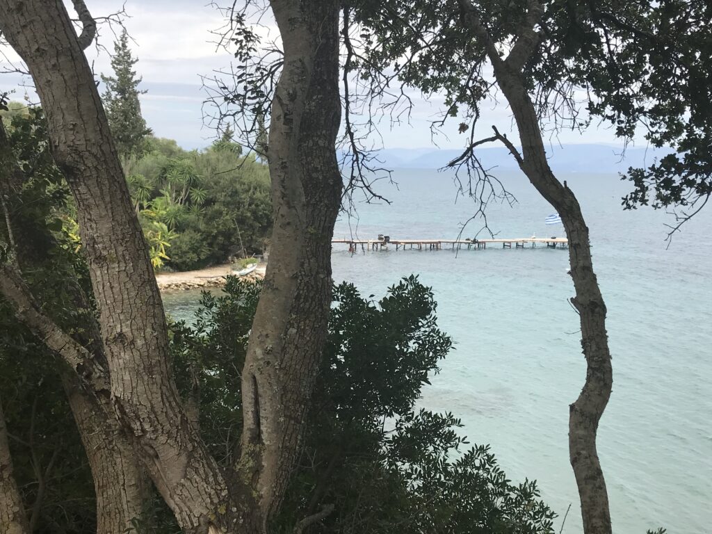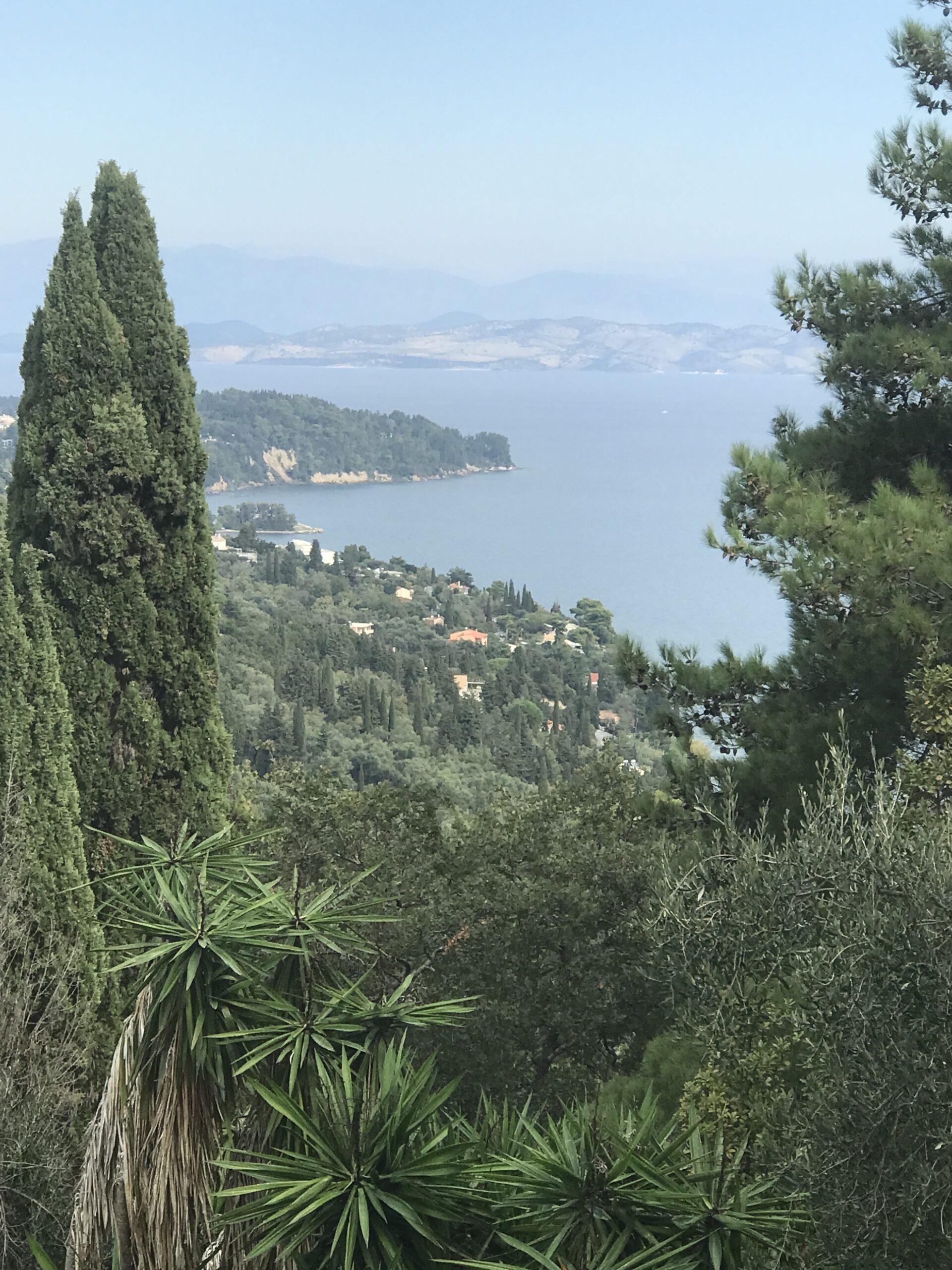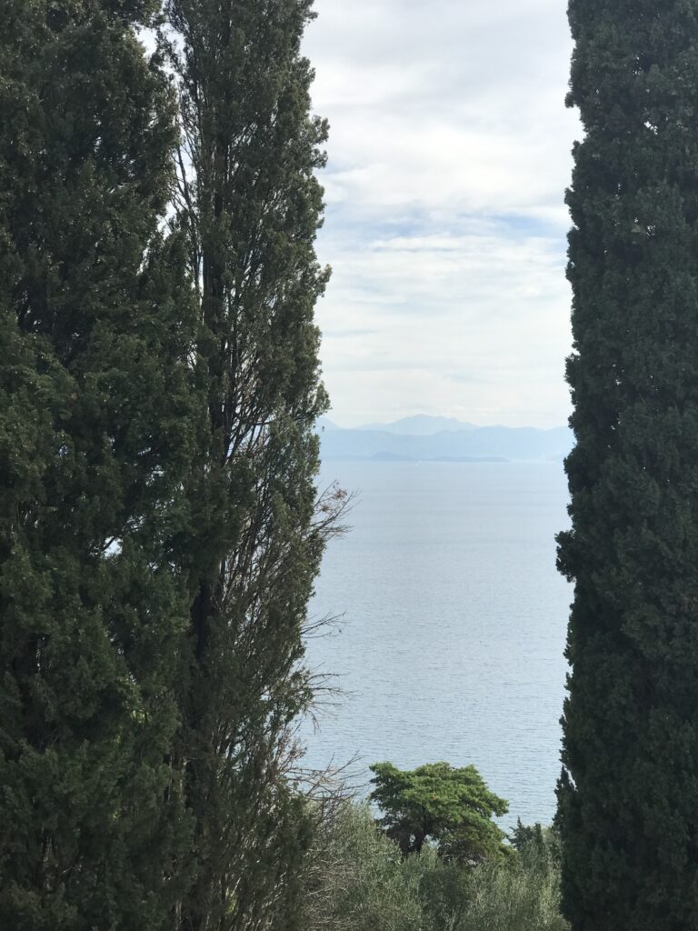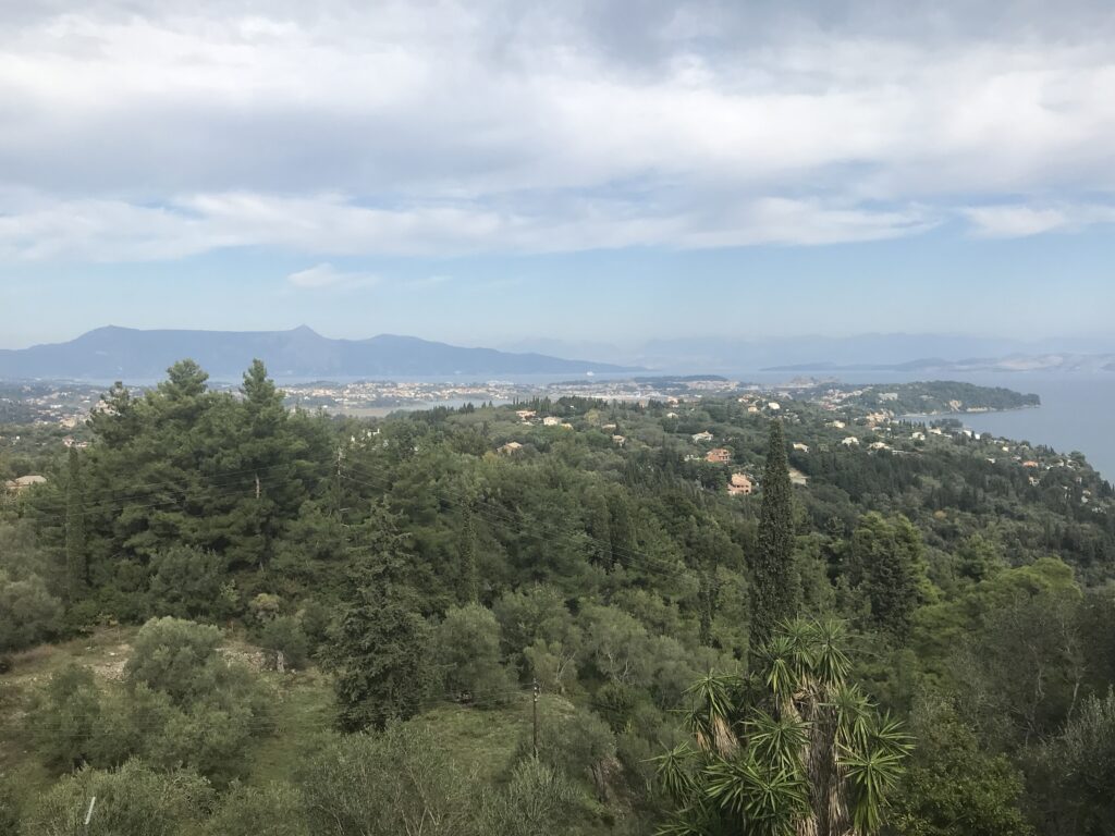 Wir fuhren in der Absicht einen botanischen Garten zu besichtigen an der Küste entlang in den Süden auf der Ostseite der Insel. Im Panorama Restaurants des Gartens wollten wir essen. Wir hatten auch überlegt dort zu wohnen und sie hatten uns, leider zu spät (wir hatten dann schon in Korfu Stadt gebucht) ein Zimmer angeboten. Deshalb gingen wir davon aus sie haben noch geöffnet. Leider war das nicht der Fall, die Tür war offen, aber ein großer Schäferhund mit langer Kette hielt uns davon ab einzutreten. Es erschien dann eine Frau, die herum werkelte. Wir fragten sie freundlich, aber sie war sehr unhöflich und murmelte nur etwas von closed aus der Ferne und sie hatte es nicht mal nötig näher zu kommen. Dann waren wir froh, dass das Übernachtungsangebot zu spät kam.