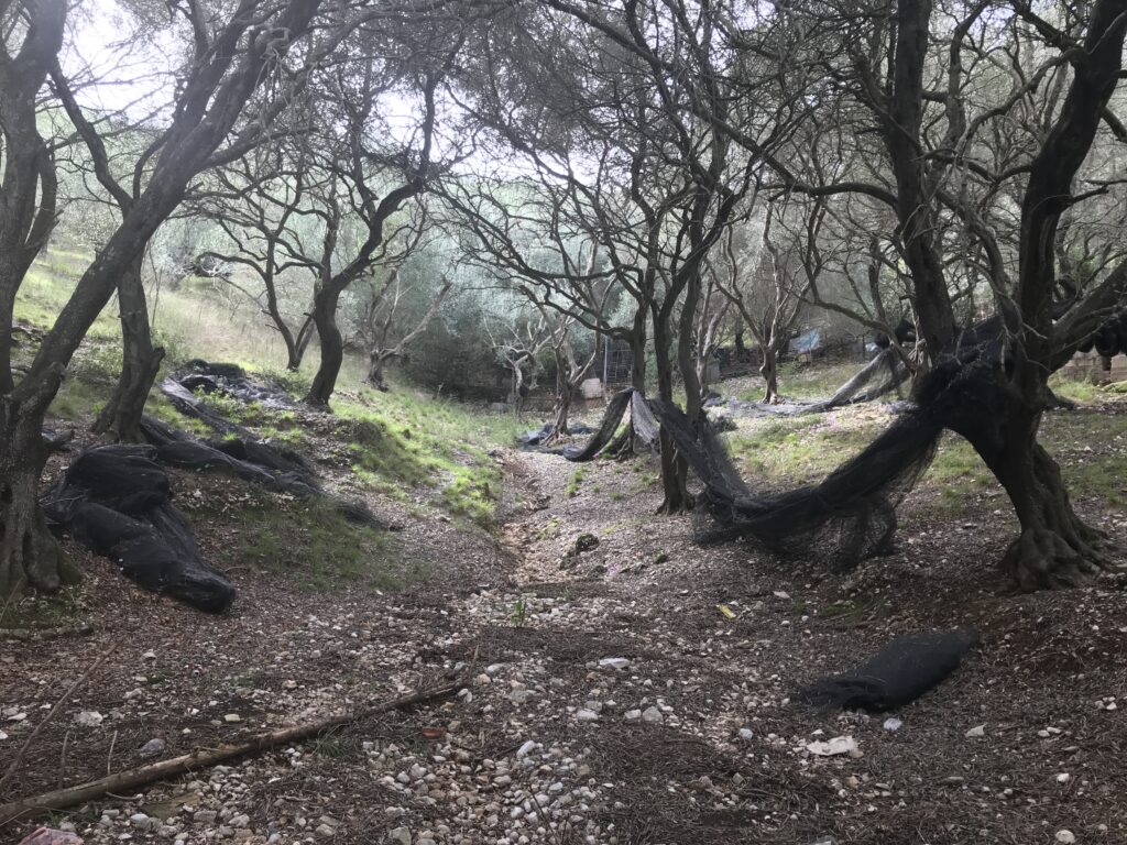 Auf der Strecke sahen wir einige Strände, die uns gar nicht gefielen, auch lag überall viel Müll. Einen schönen habe ich kurz nach einer Kurve dann doch gesehen, aber zack da waren wir schon vorbei – leider kein Foto. Einen der großen Fischdrawler, die Sardinen fischen, haben wir noch in der Bucht. Schön waren die kleinen wilden Alpenveilchen überall zwischen den Bäumen und viele alte Olivenbäume, die Netze liegen schon zur Ernte bereit. Oft war die Luft nicht gut, denn sie verbrannten Stellen ihren Müll, das ist schrecklich. Man kann sich gut vorstellen, warum so manches Feuer ausbricht.