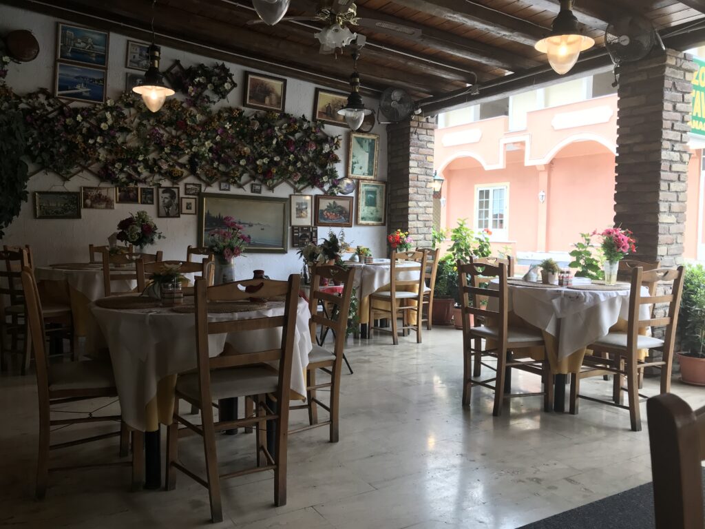 Sehr interessant, ein Highlight heute war unser Essen, wir dachten schon wir verhungern, an der ganzen Küste entlang alles zu. Wir wollten also zurück in die Stadt und da sahen wir direkt an der Straße eine kleine Taverne, „Zorbas Taverna“ und hielten an. Ich ging hinein um zu sehen, ob es wirklich geöffnet war – kein Mensch da, alles offen, die Küche leer, ich wollte enttäuscht wieder gehen, dann sah ich wie am Rand ein älterer Mann mit Besen handierte und sprach ihn an. Er war bekleidet mit einen altmodischen Jogginganzug, meinte aber in ganz gutem Englisch natürlich hätte er offen, er hat auf uns gewartet. Wir aßen dann dort ganz hervorragend und irgendwann, kurz vor dem Bezahlen kamen wir ins Gespräch und haben uns sehr interessant mit ihm ca. 1 Stunde lang über Griechenland, die Griechen, Politische Historie und aktuelle Politik unterhalten. Er hat auch nur noch 2 Tage offen, dann fliegt er nach Ungarn und unterrichtet dort dann 7 Monate an einer griechischen Schule, Geschichte, Griechisch, Mathematik. Vor der Taverne hatte er schöne Kübelpflanzen, im überdachten Bereich Plastikblumen auf den Tischen und es schepperte laut das Radio mit griechischer Volksmusik. Alles sehr skurril.