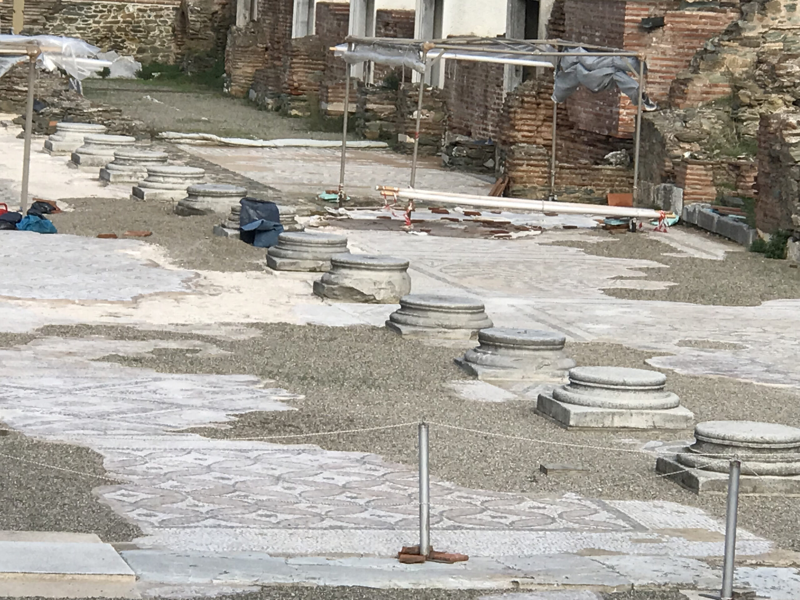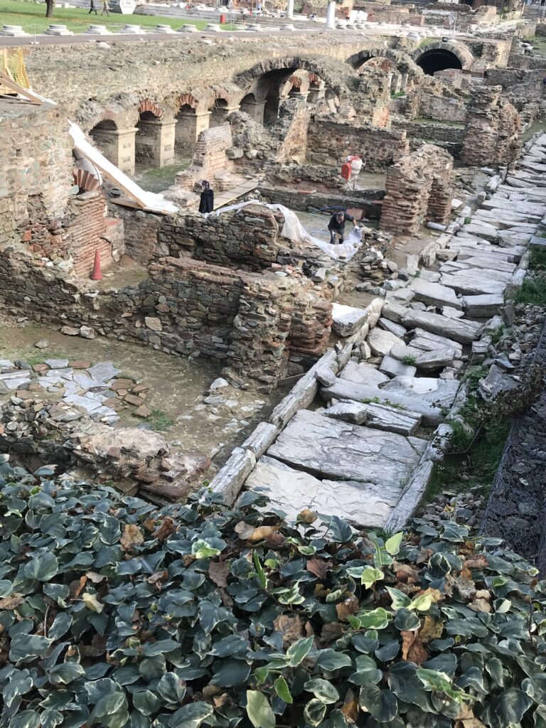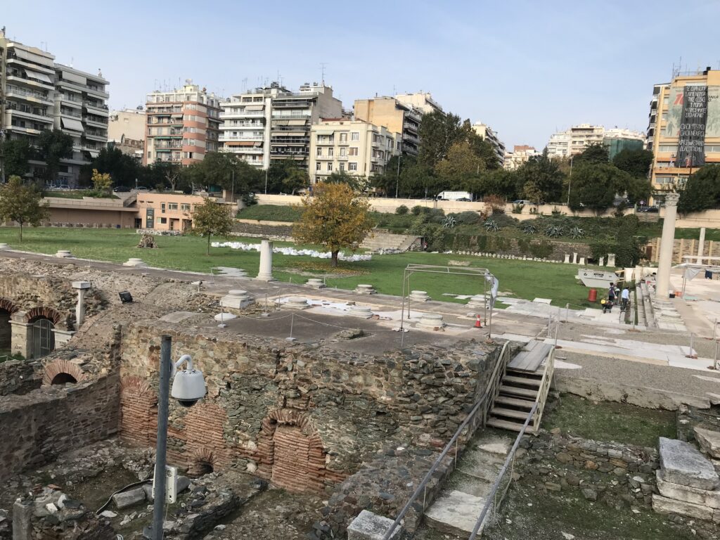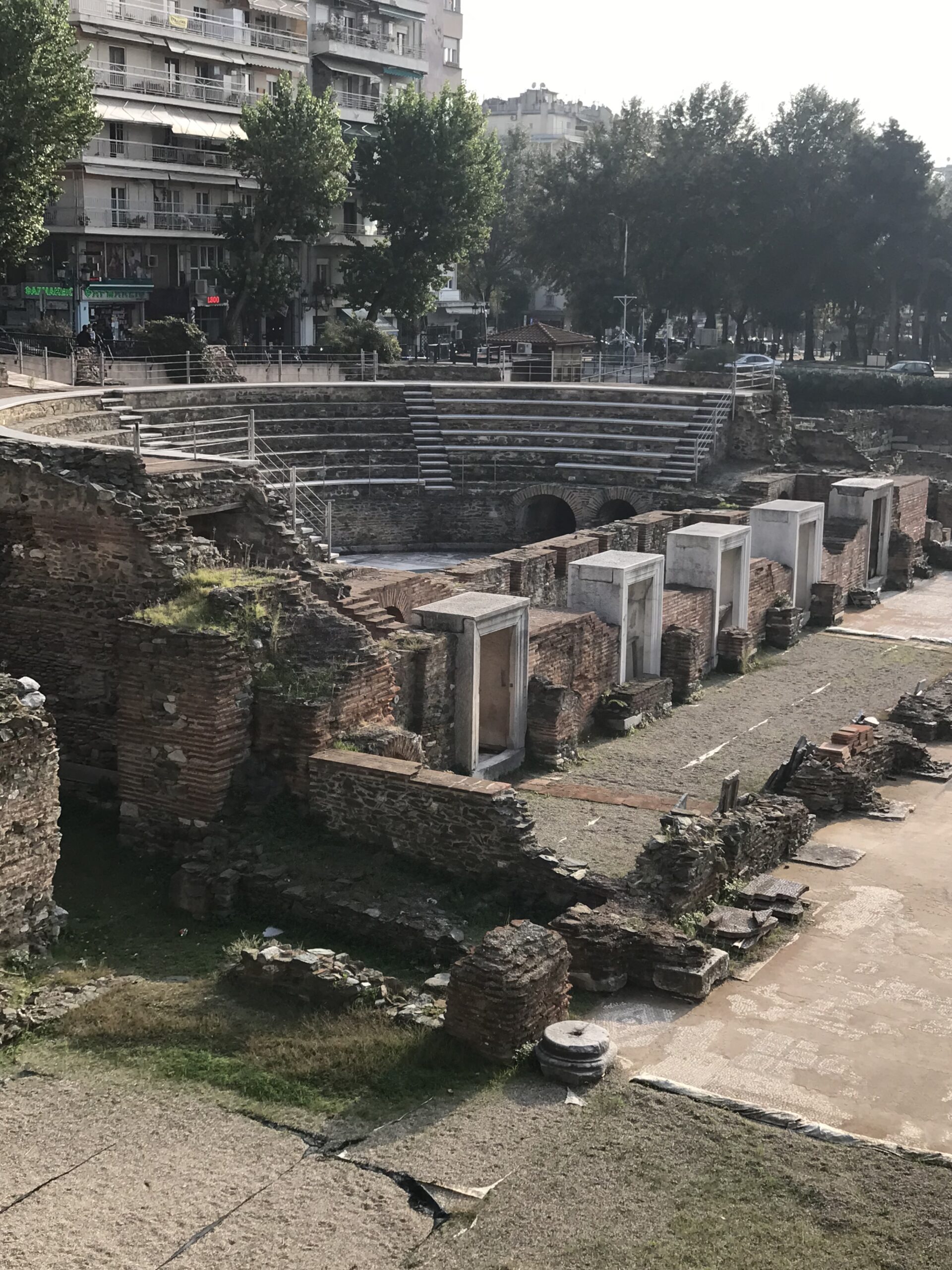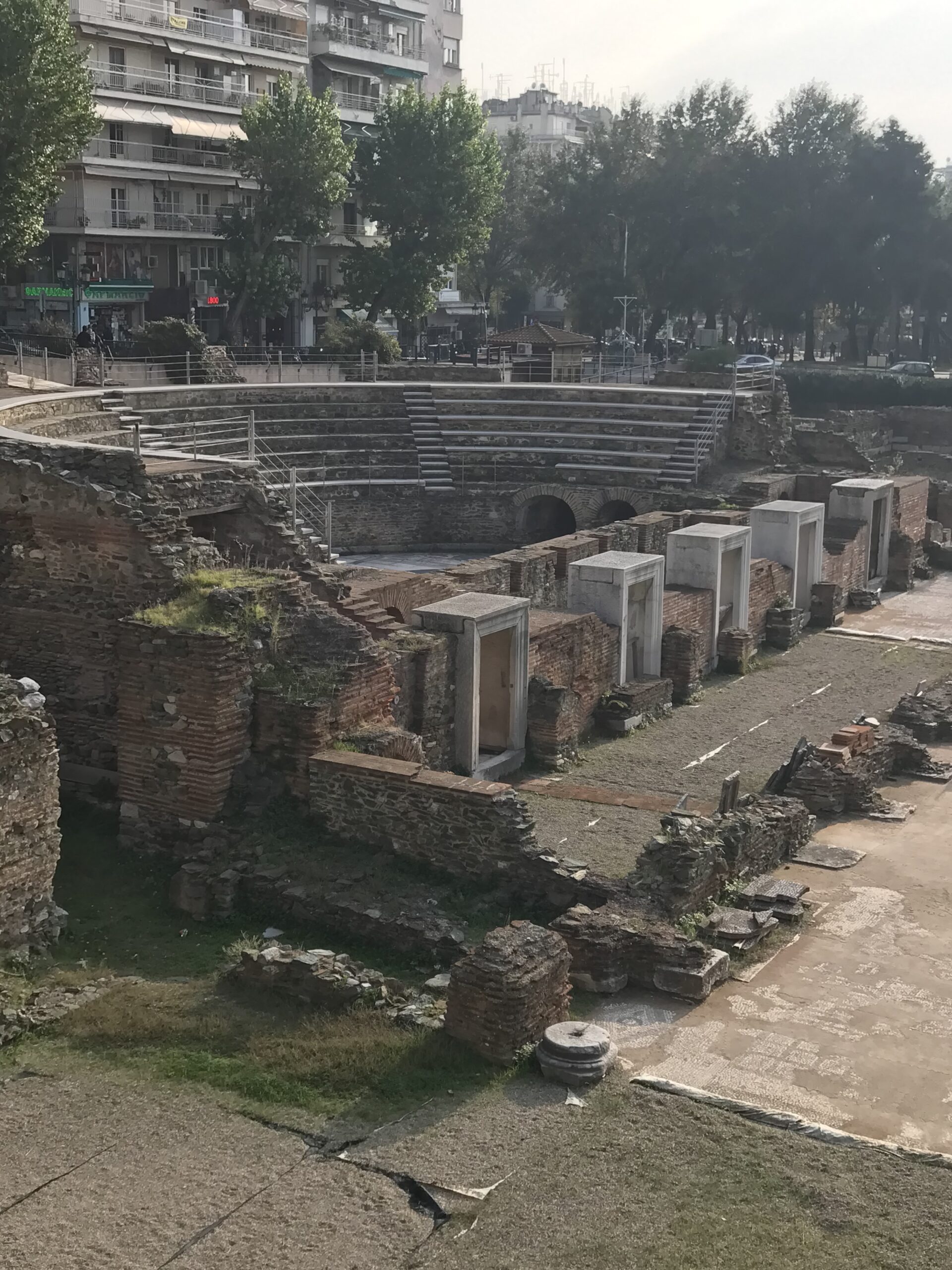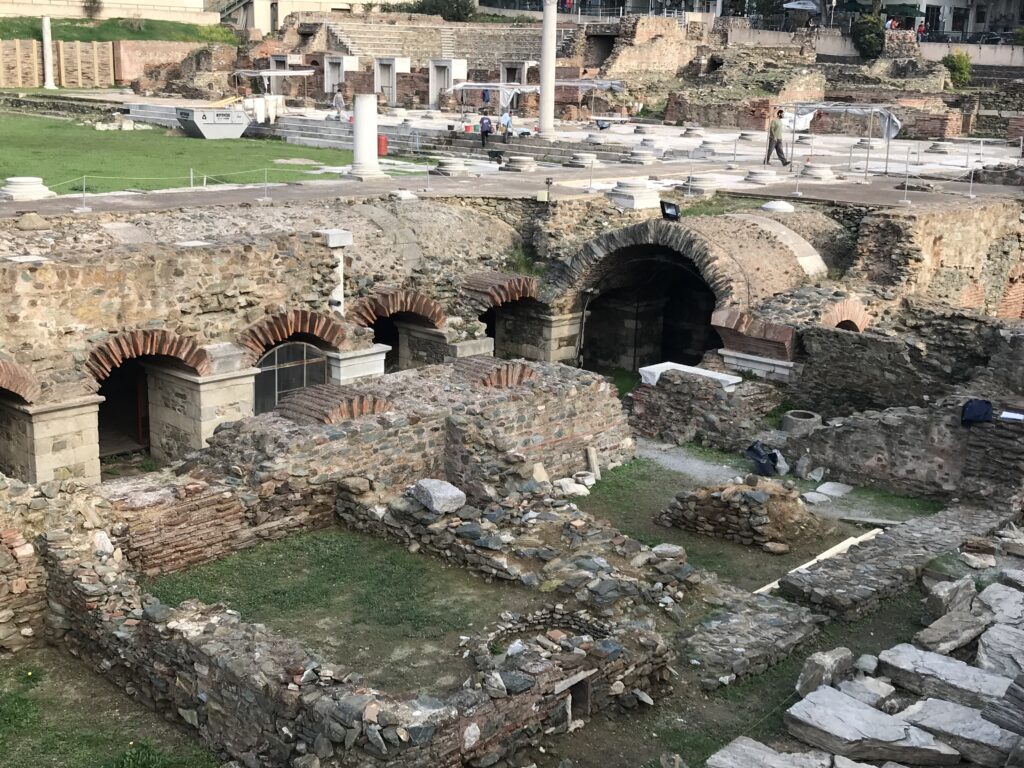 Die Stadt ist ganz anders als Athen. Es gibt so gut wie keine griechischen Altertümer, höchstens mal ein paar Mauerreste. Es gibt ein römisches Forum, das wir uns von außen ansehen konnten, es wurden Ausgrabungen durchgeführt und man durfte das Gelände nicht betreten. Diese römischen Reste wurden erst nach dem Brand 1917 entdeckt und erst 1960 als an dieser Stelle ein Gerichtsgebäude errichtet werden sollte, kämpften die Archäologen lange, aber mit Erfolg dafür, dass das Forum erhalten blieb. Es war also ein Marktplatz mit einem gepflasterten Hof mit einer Säulenhalle. Integriert ist ein kleines Theater, das heute wieder genutzt wird.