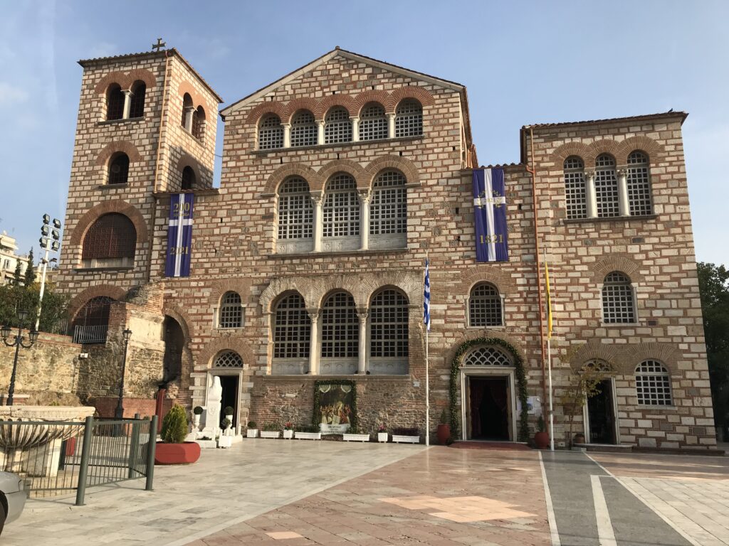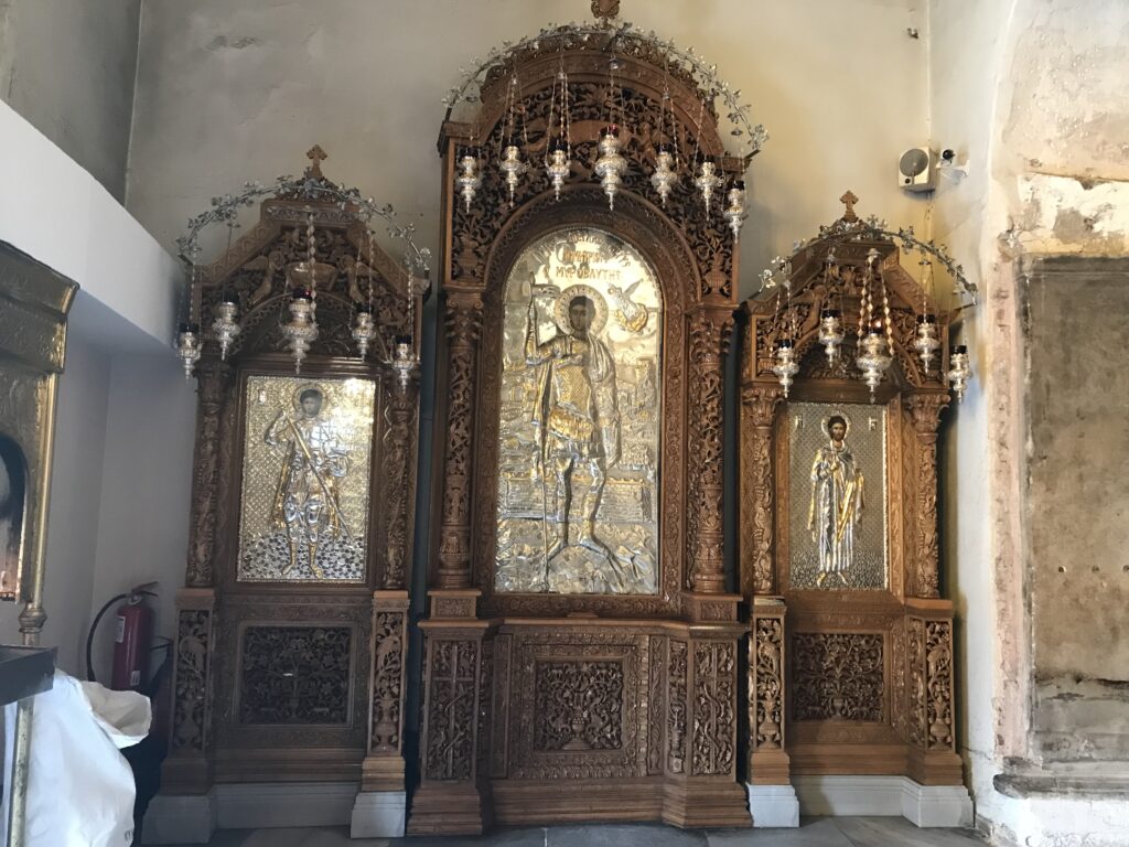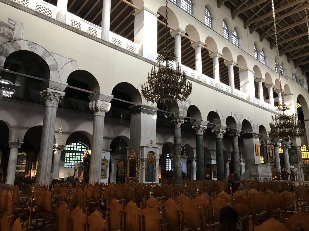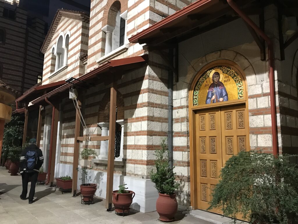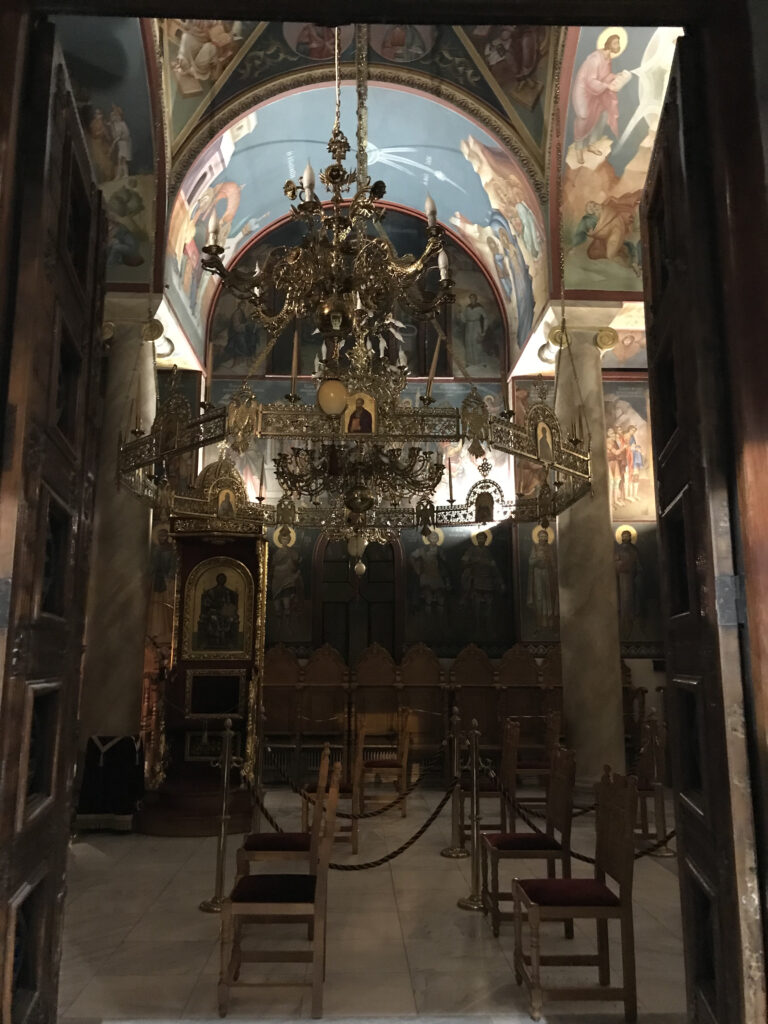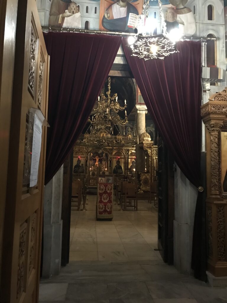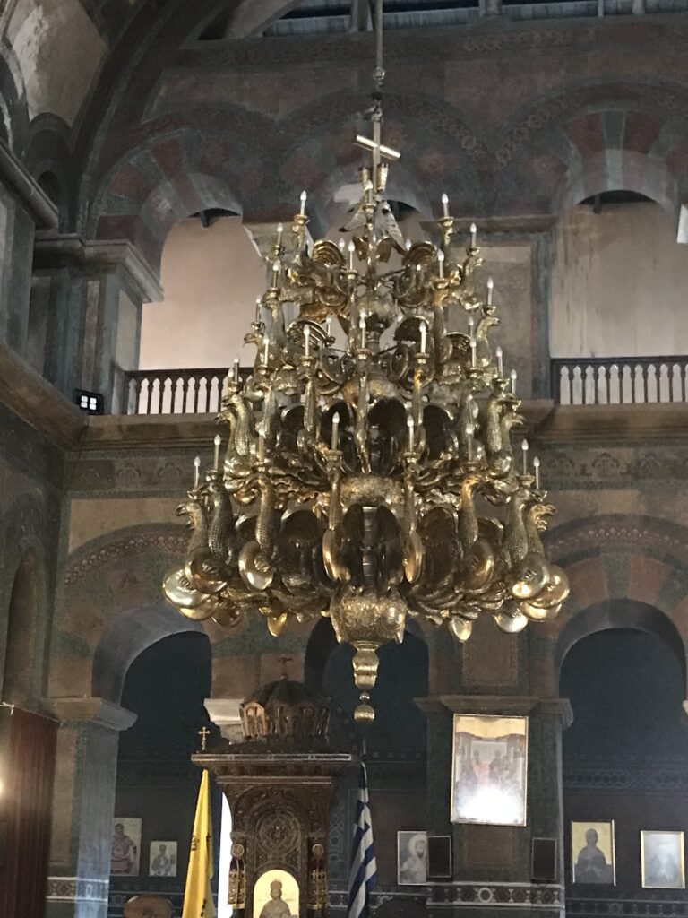 Dann haben wir viele Kirchen gesehen und einige besichtigt, die Agia Sofia und die Agios Dimitrios. Irre, wie prunkvoll die alle ausgestattet sind und wieviele Menschen vorbei kommen, ein bestimmtes Bild küssen, eine. Sarg berühren oder streicheln oder Kerzen anzünden. Am Ende entdeckten wir noch eine Kirche, die zwischen den Kaufhäusern eingebaut war, von außen als solche kaum zu erkennen.