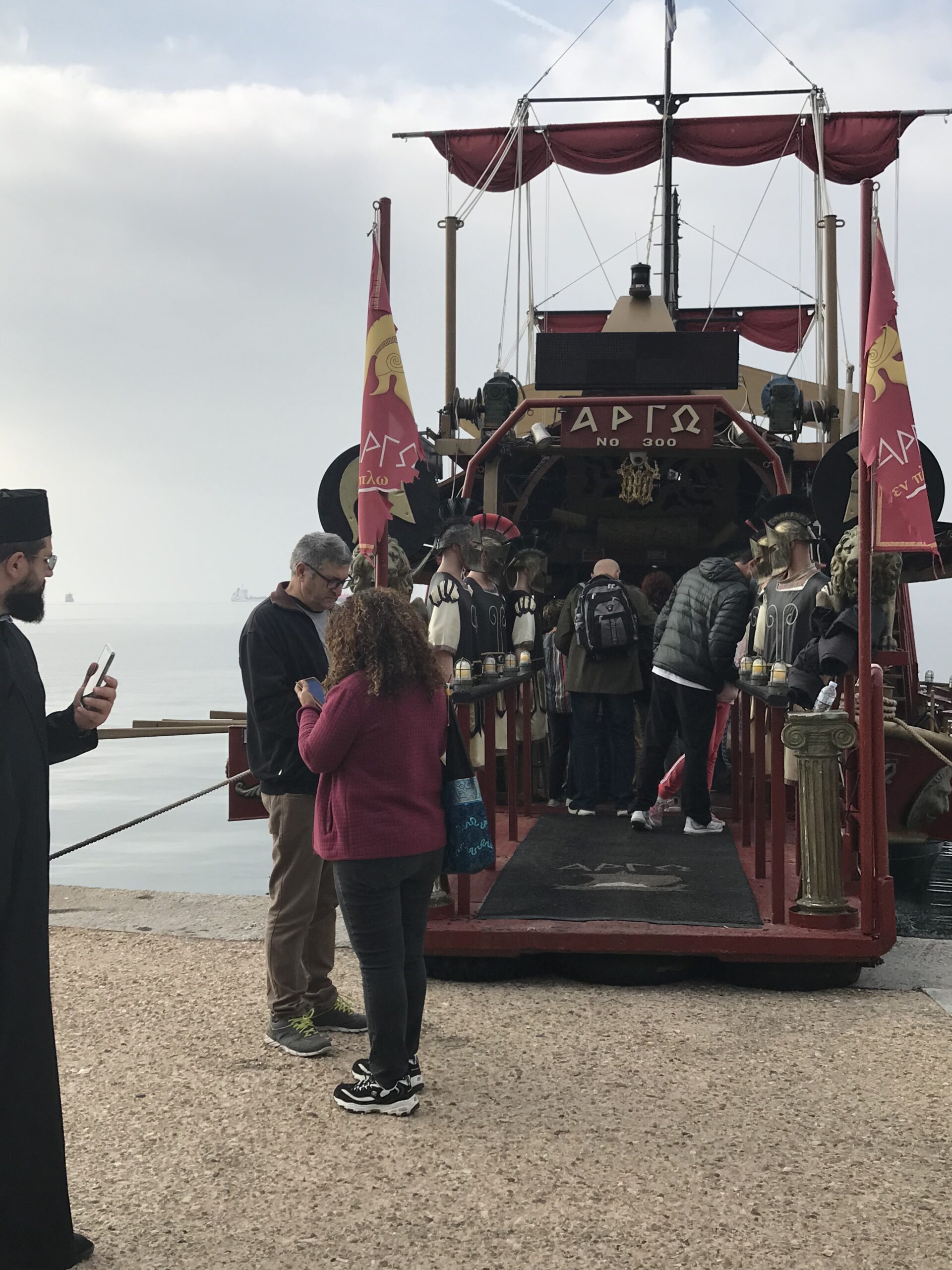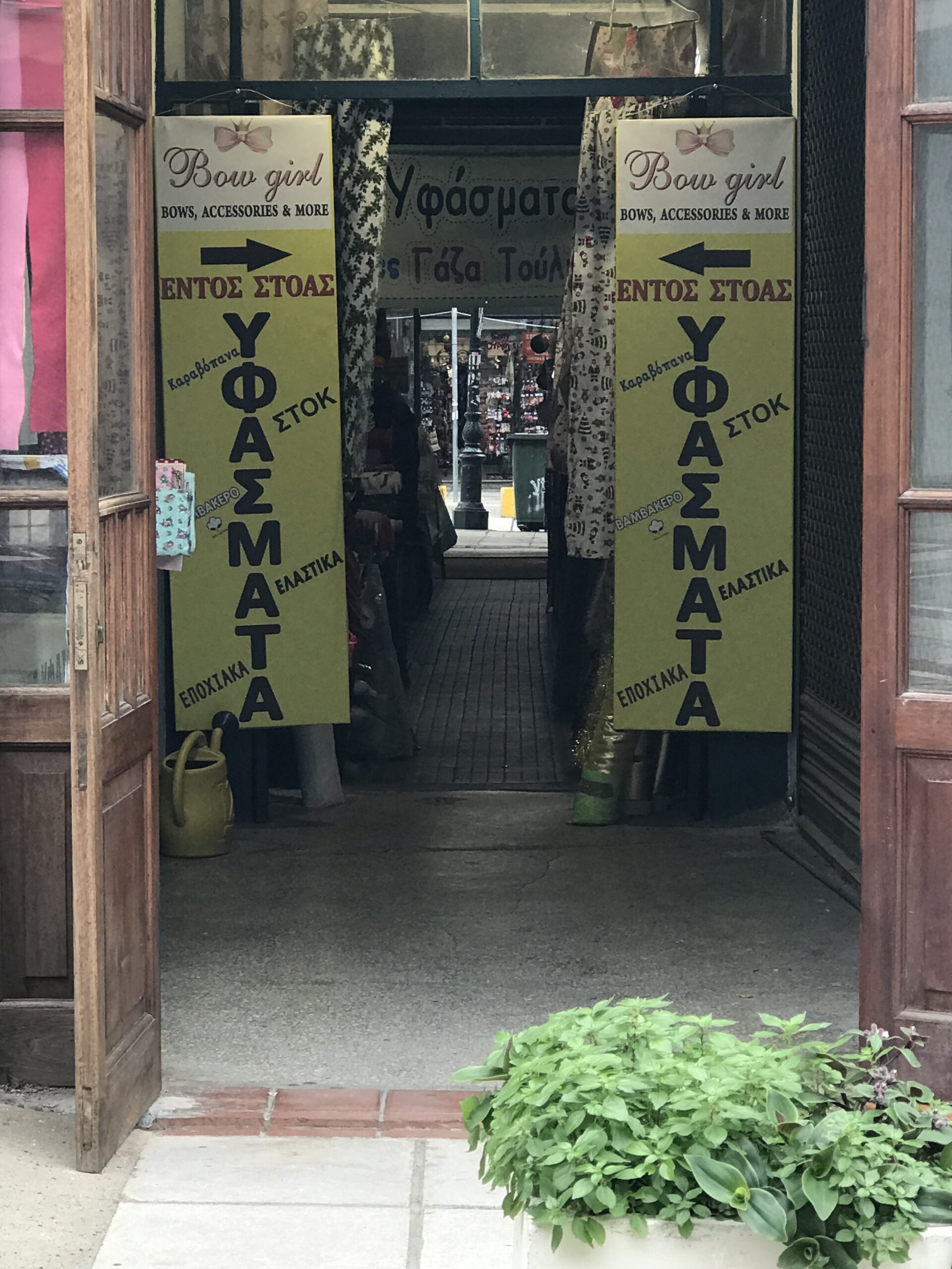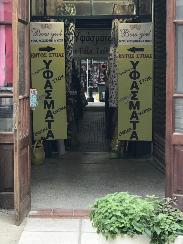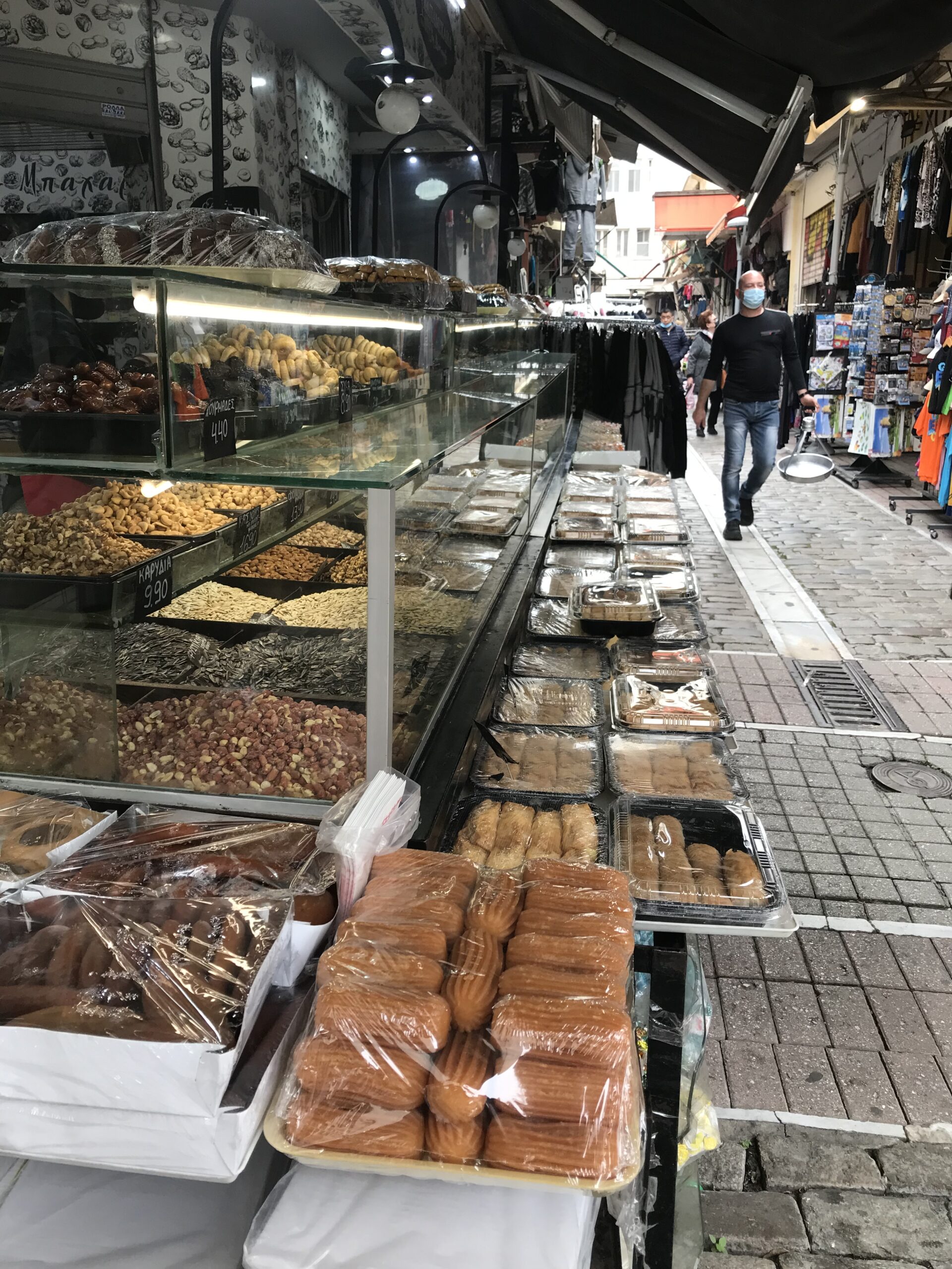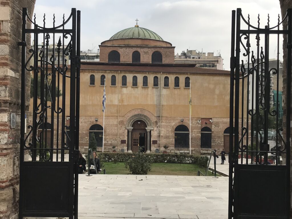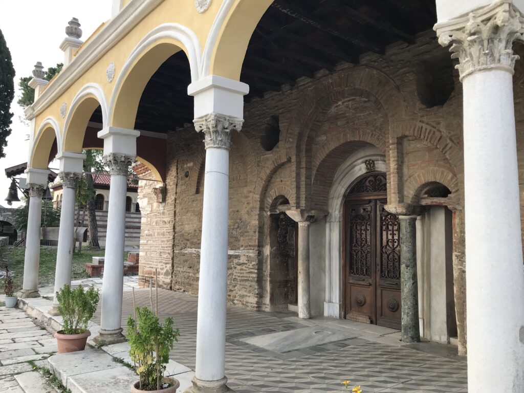 Dann haben wir viele Kirchen gesehen und einige besichtigt, die Agia Sofia und die Agios Dimitrios. Irre, wie prunkvoll die alle ausgestattet sind und wieviele Menschen vorbei kommen, ein bestimmtes Bild küssen, eine. Sarg berühren oder streicheln oder Kerzen anzünden. Am Ende entdeckten wir noch eine Kirche, die zwischen den Kaufhäusern eingebaut war, von außen als solche kaum zu erkennen.