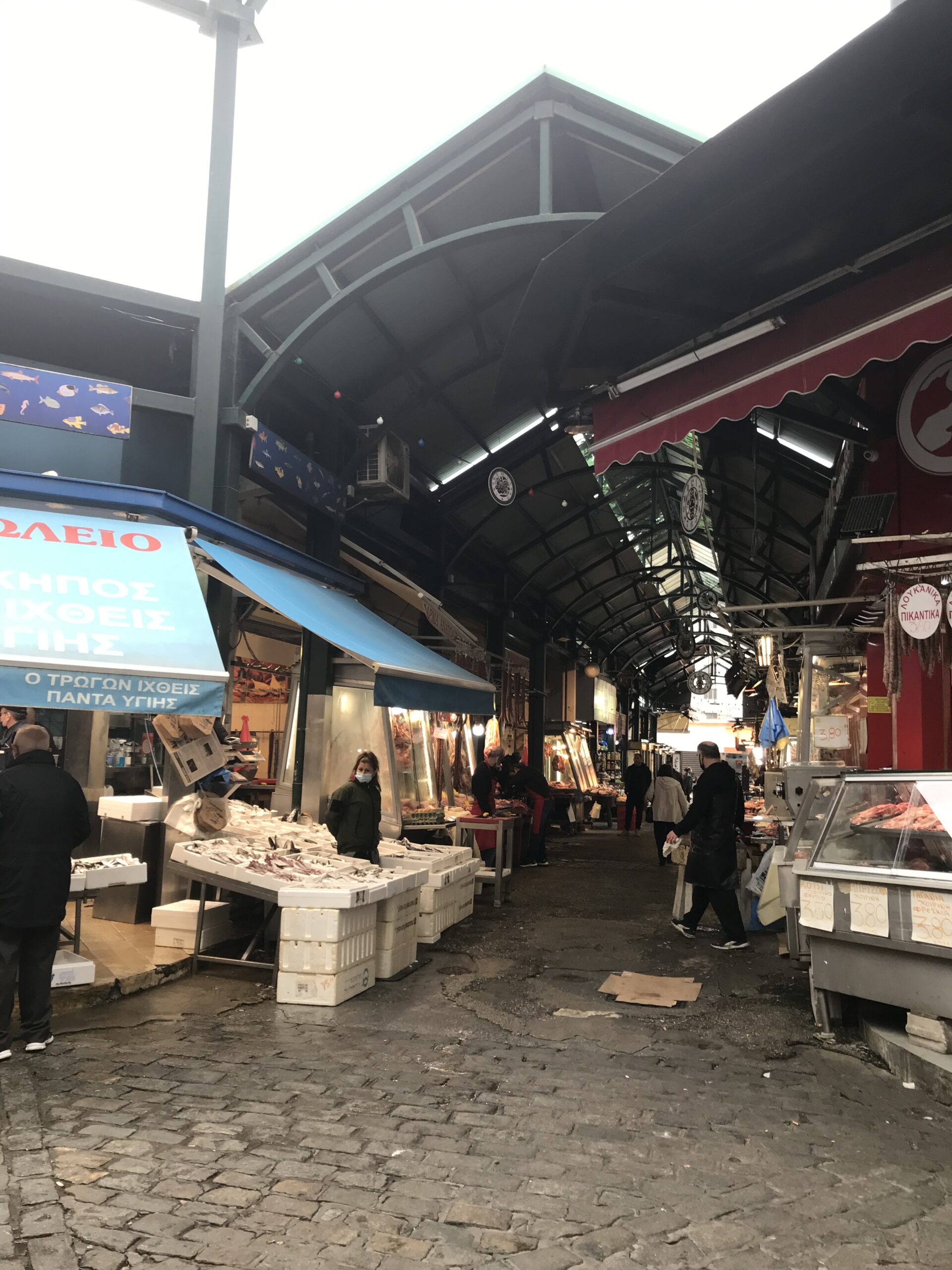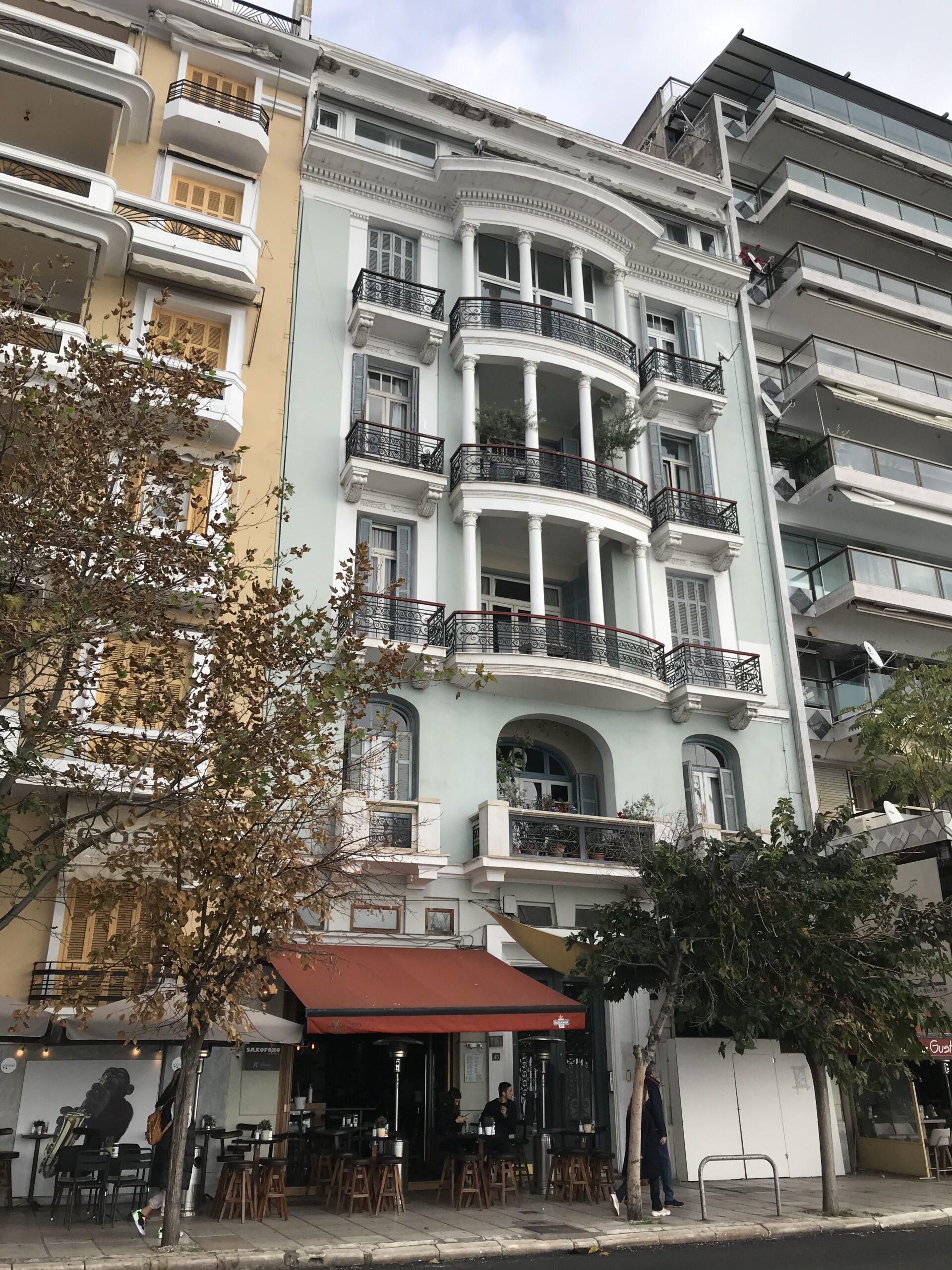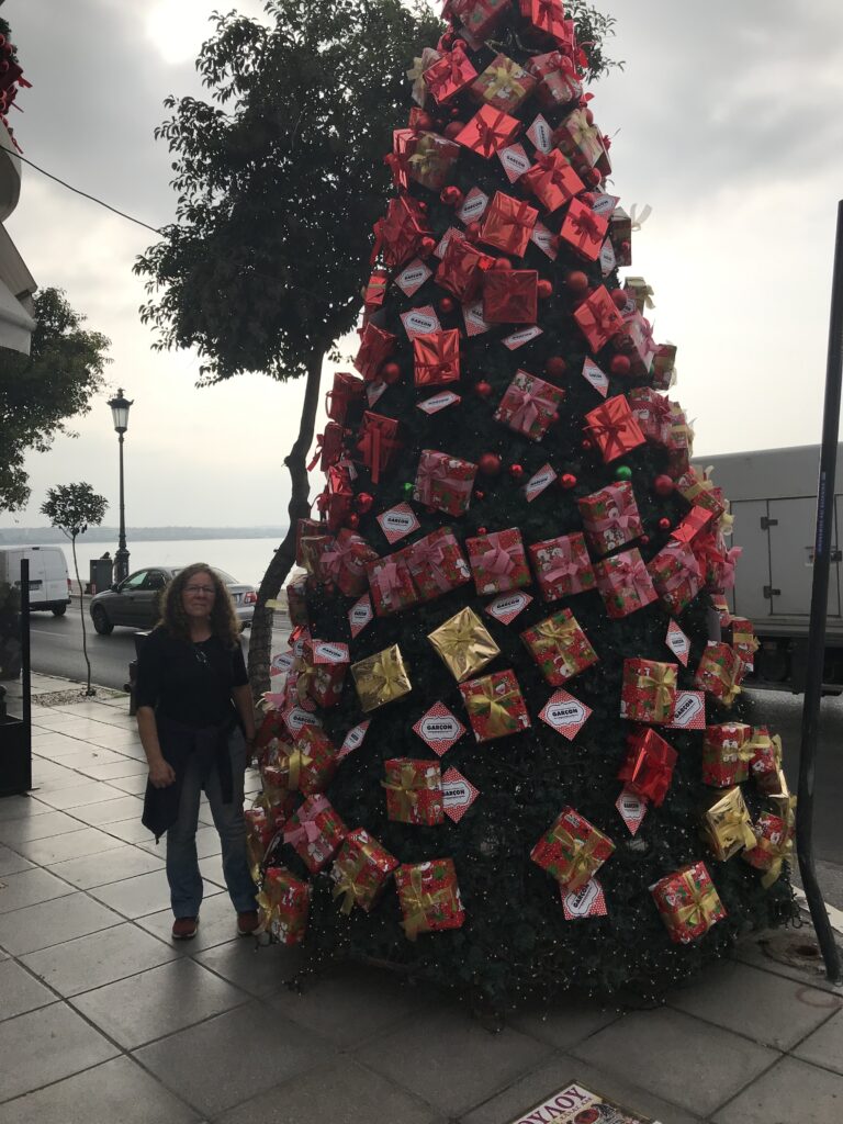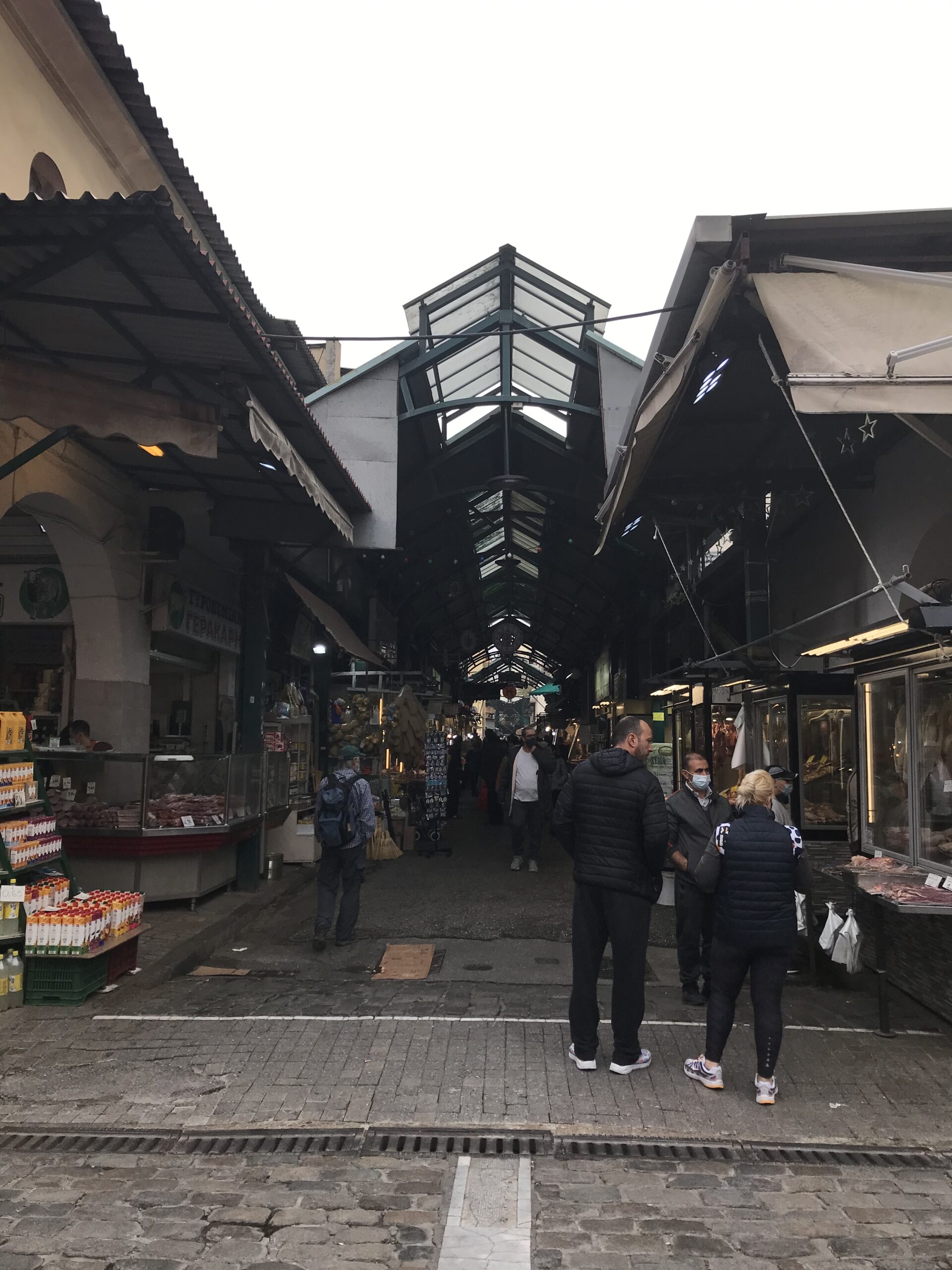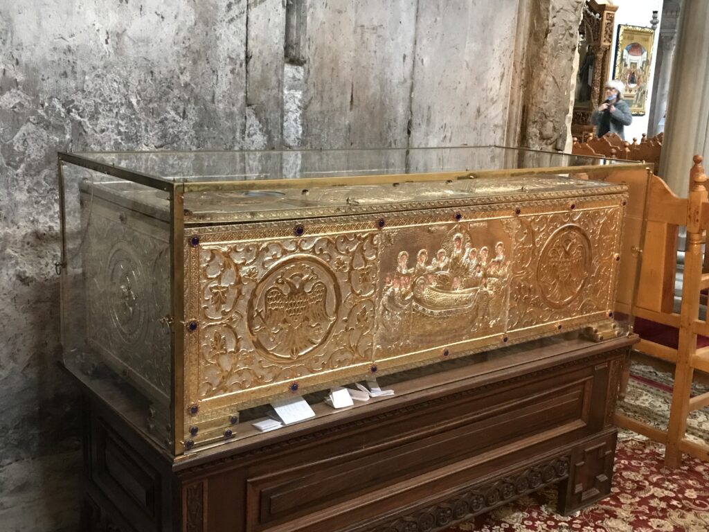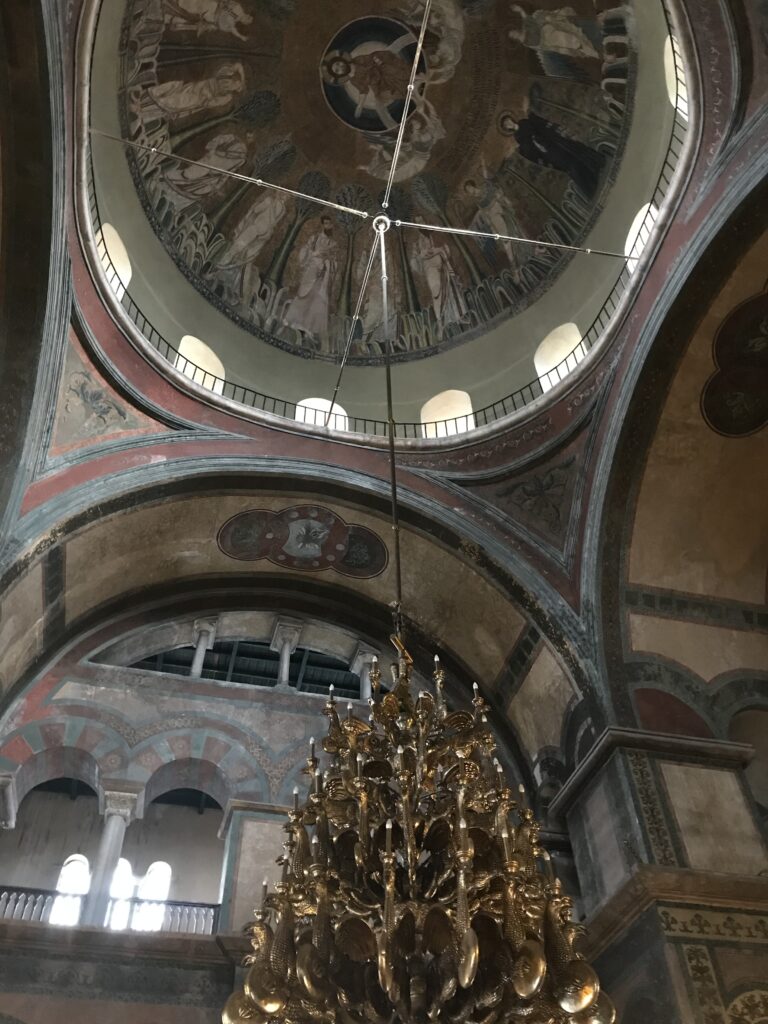 Dann haben wir viele Kirchen gesehen und einige besichtigt, die Agia Sofia und die Agios Dimitrios. Irre, wie prunkvoll die alle ausgestattet sind und wieviele Menschen vorbei kommen, ein bestimmtes Bild küssen, eine. Sarg berühren oder streicheln oder Kerzen anzünden. Am Ende entdeckten wir noch eine Kirche, die zwischen den Kaufhäusern eingebaut war, von außen als solche kaum zu erkennen.